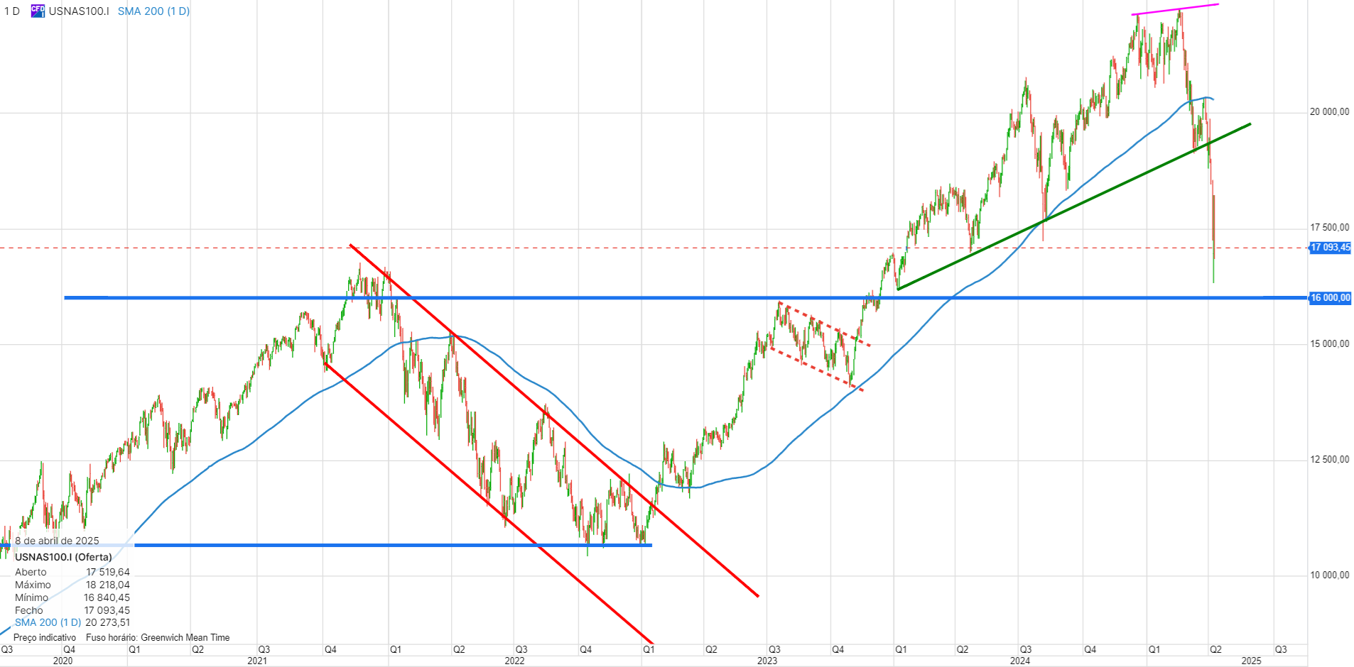 De salientar que a Média móvel de 200 dias, está agora a inverter e a começar a apontar para baixo, e isso costuma ser sinal de quedas prolongadas. Os 16000 são agora o próximo grande suporte