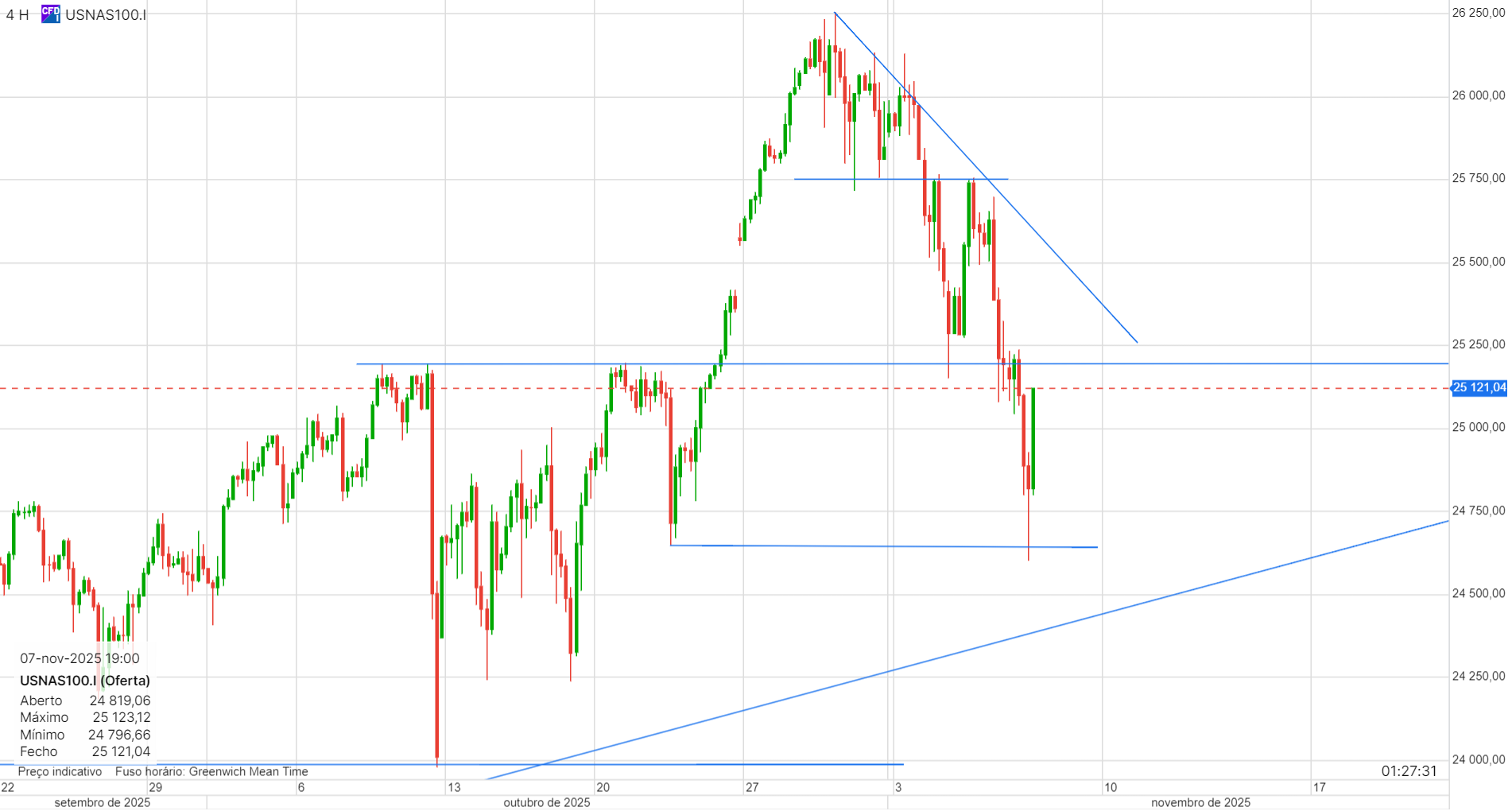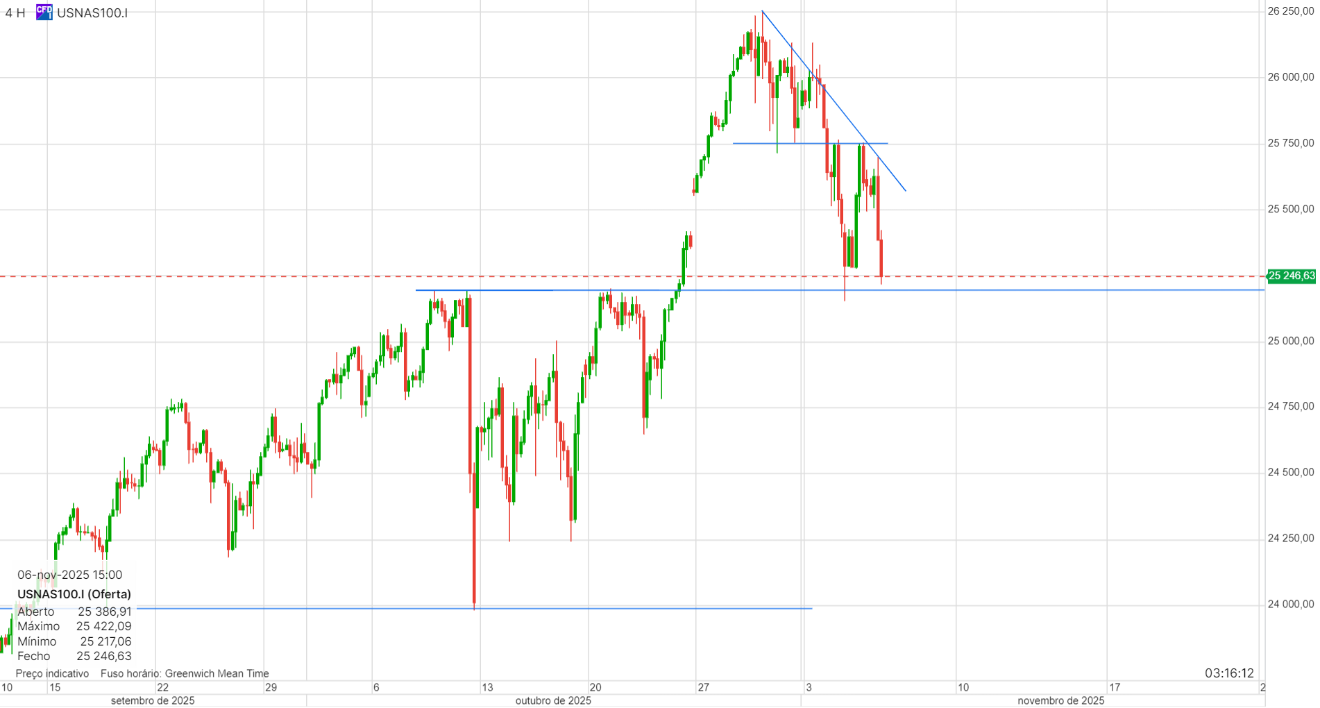 Alguma falta de força e quebras relativamente bruscas. Os 25200 serviram de suporte, mas o anterior suporte, nos 25750 passou a resistência.