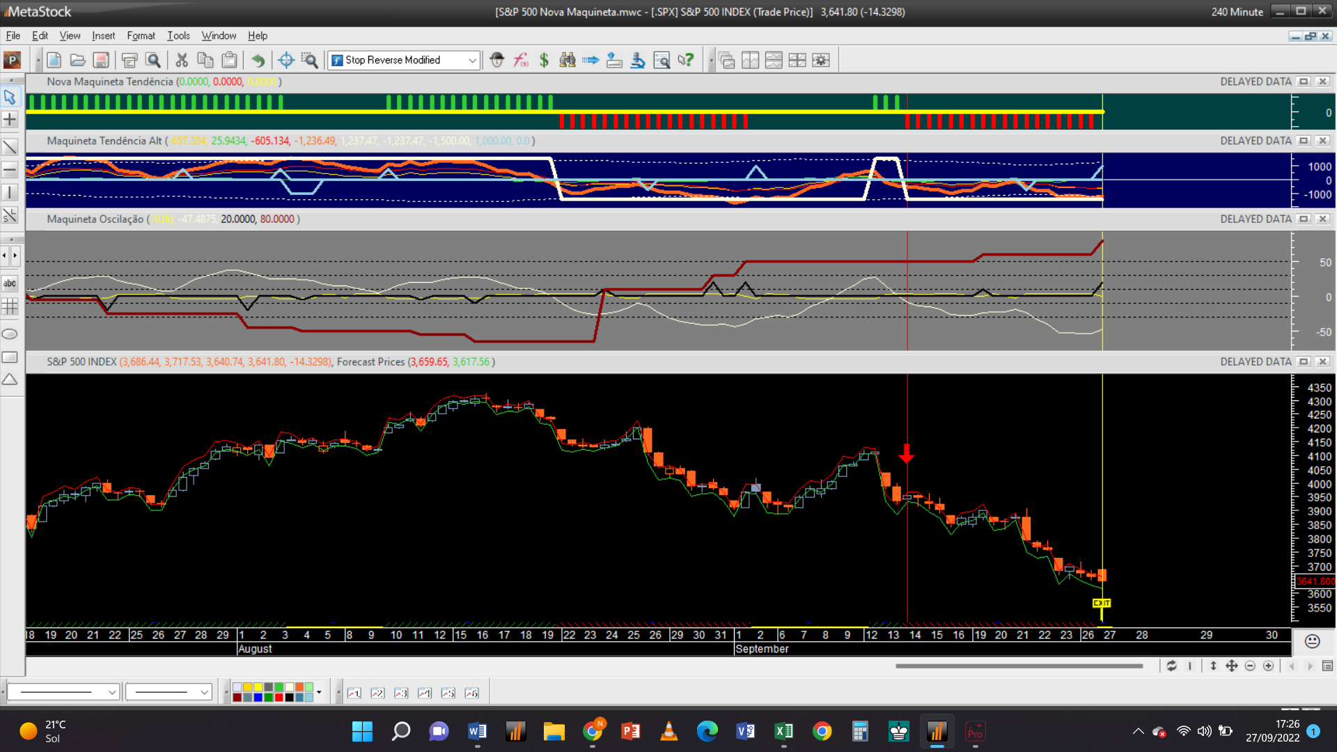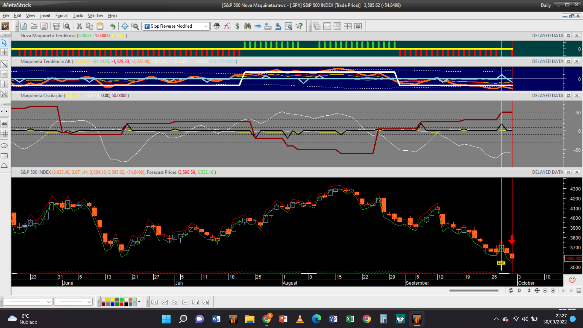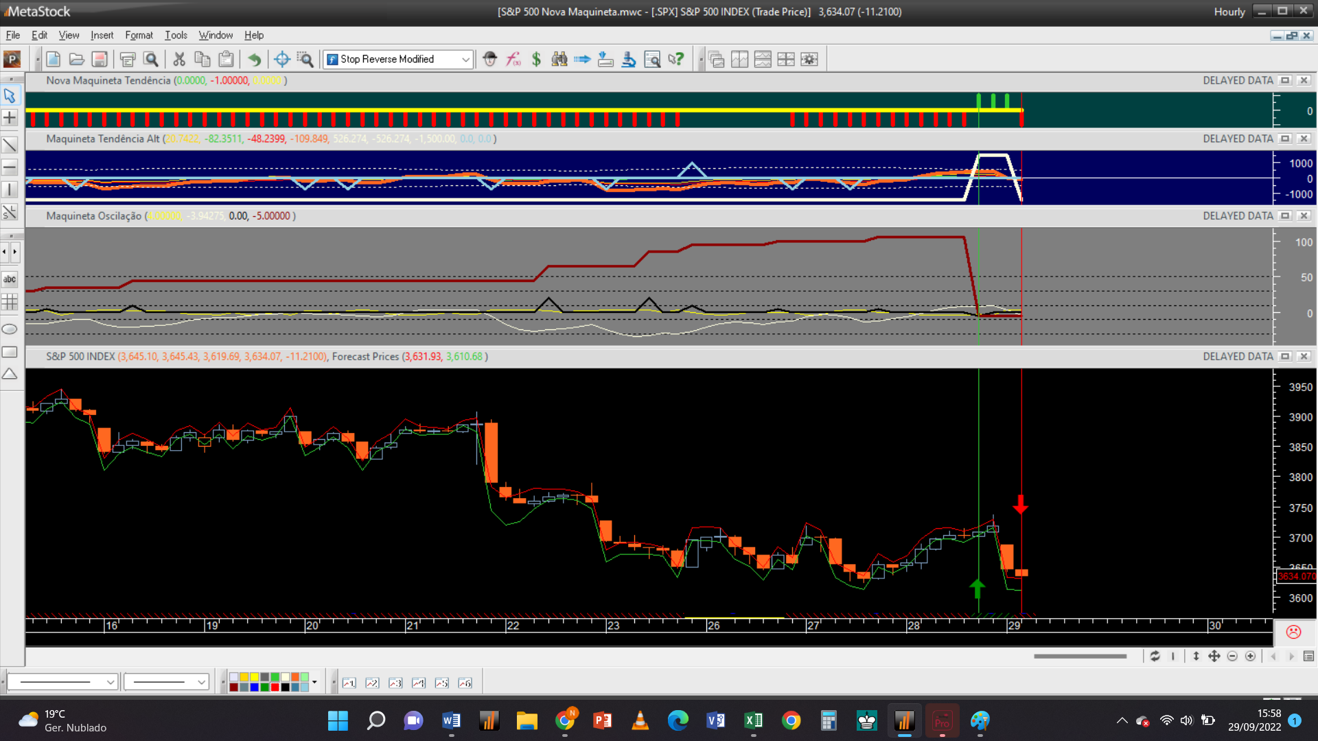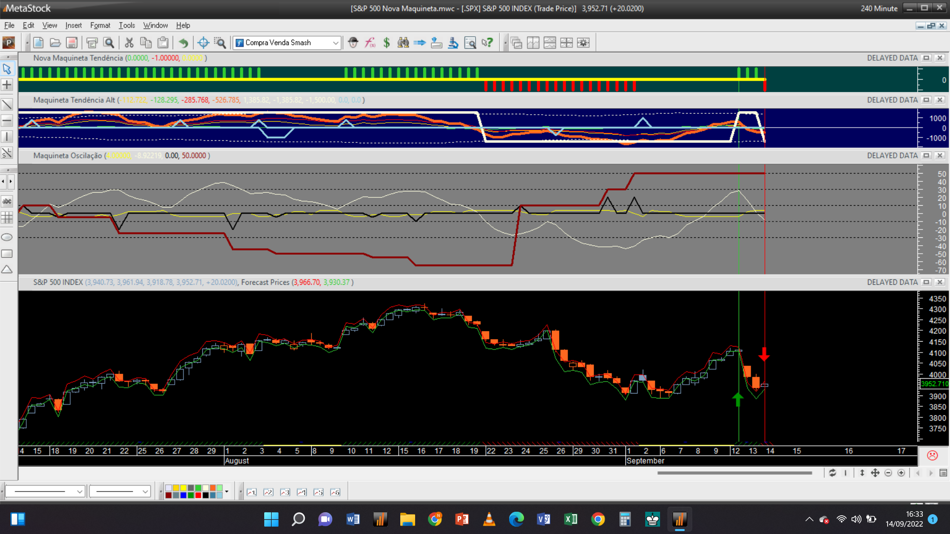 - Fecho compulsivo na posição oscilatória longa da escala 1H ontem aberta, pelo facto das tendências nos 2 gráficos imediatamente acima registarem sentido descendente. A posição fechada resultou num prejuízo para a carteira S&P 500 no valor de -30 Usd / contrato (= 3953 - 3982 - 1 de comissões).