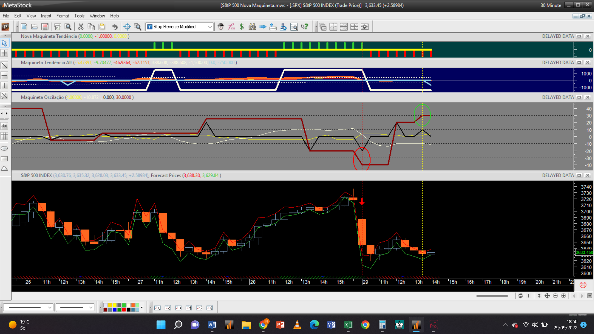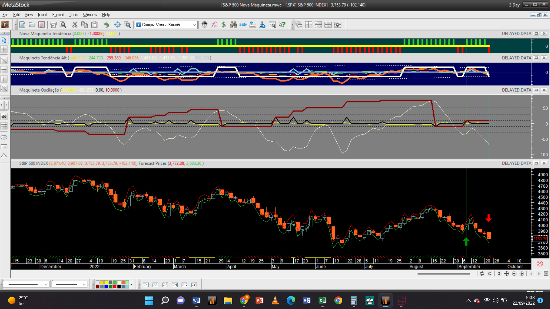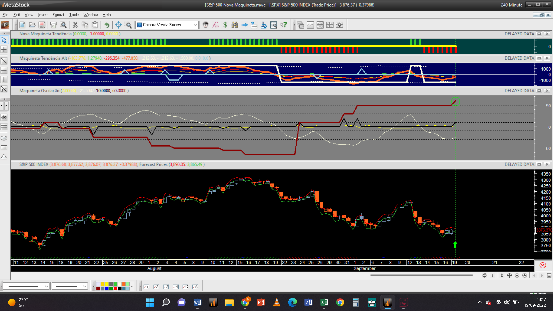 - Fecho compulsivo na posição oscilatória longa da escala 1H ontem aberta, pelo facto das tendências nos 2 gráficos imediatamente acima registarem sentido descendente. A posição fechada resultou num prejuízo para a carteira S&P 500 no valor de -30 Usd / contrato (= 3953 - 3982 - 1 de comissões).