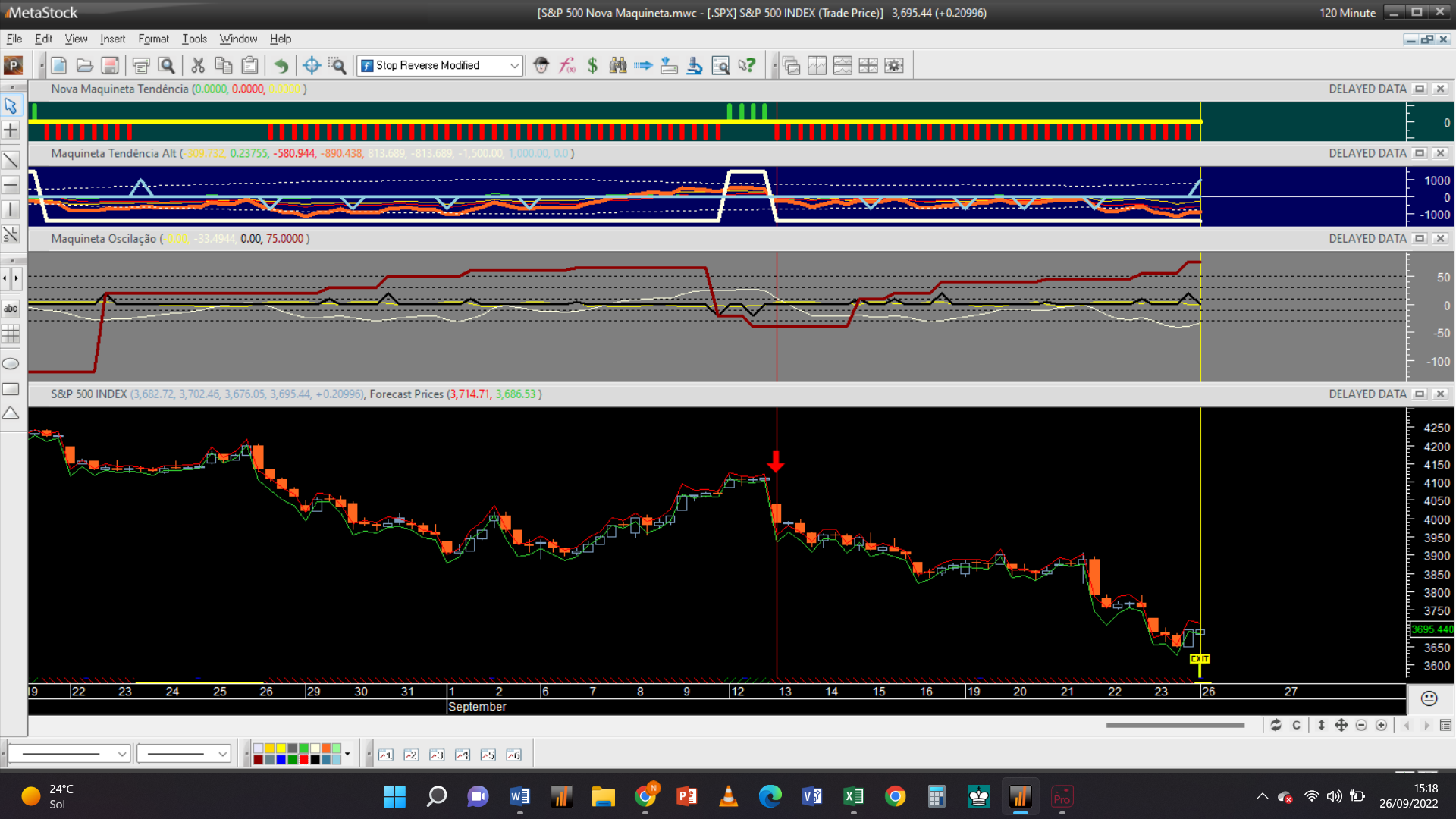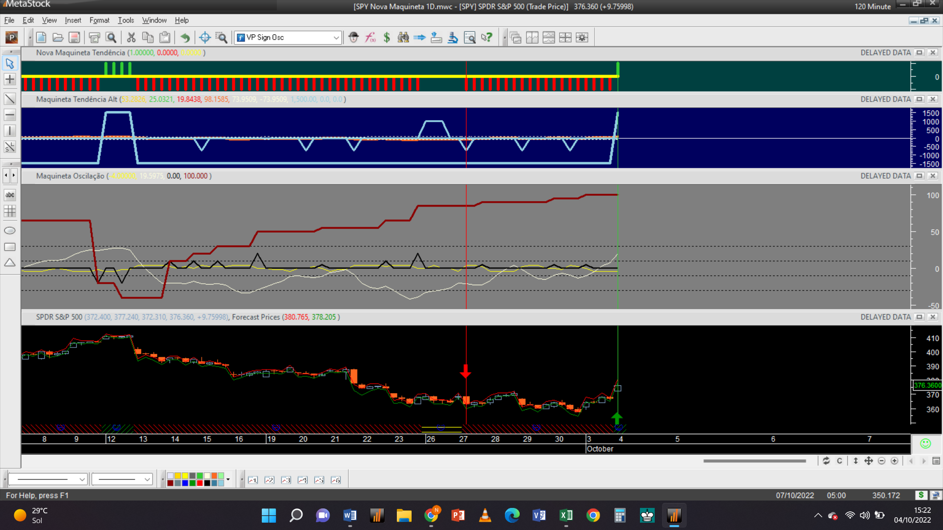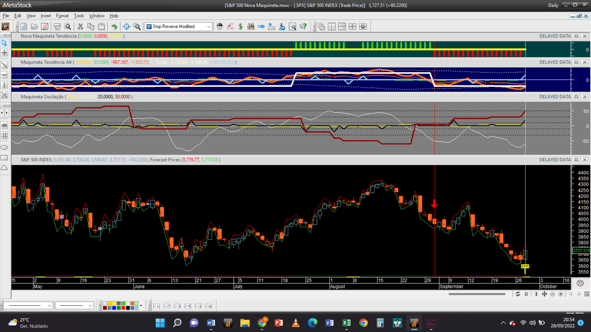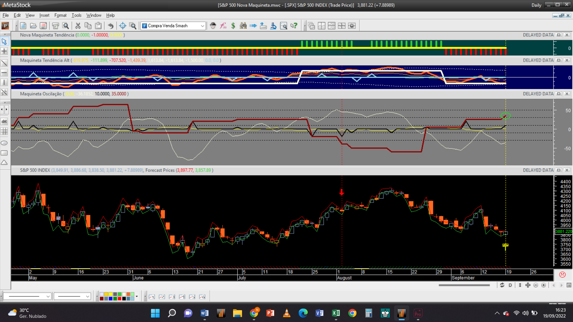 - Fecho compulsivo na posição oscilatória longa da escala 1H ontem aberta, pelo facto das tendências nos 2 gráficos imediatamente acima registarem sentido descendente. A posição fechada resultou num prejuízo para a carteira S&P 500 no valor de -30 Usd / contrato (= 3953 - 3982 - 1 de comissões).
