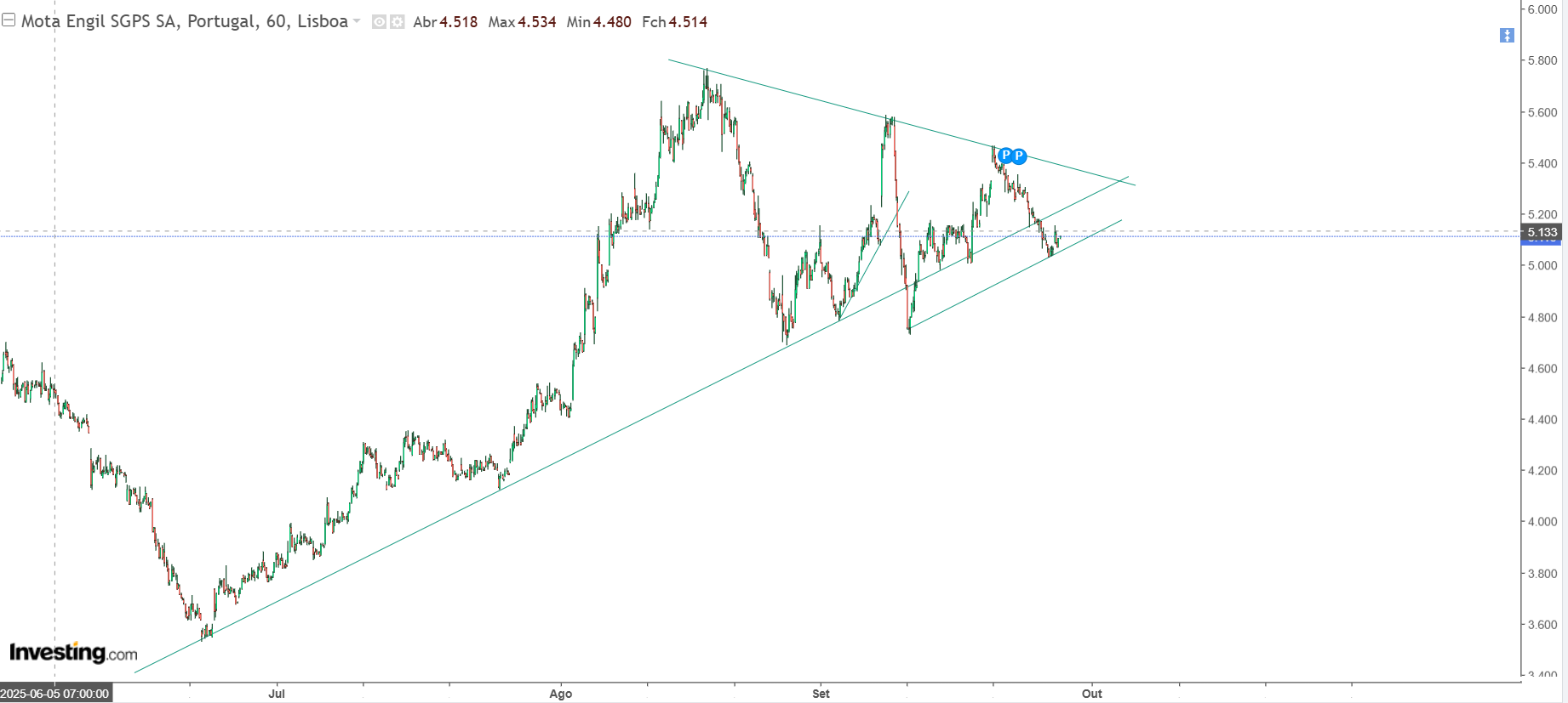 Impossível saber o desfecho de um triângulo simétrico, parte para um lado, mas não sabemos qual, mas, atendendo ao momento bull. diria que entrar a 5 é de muito baixo risco.