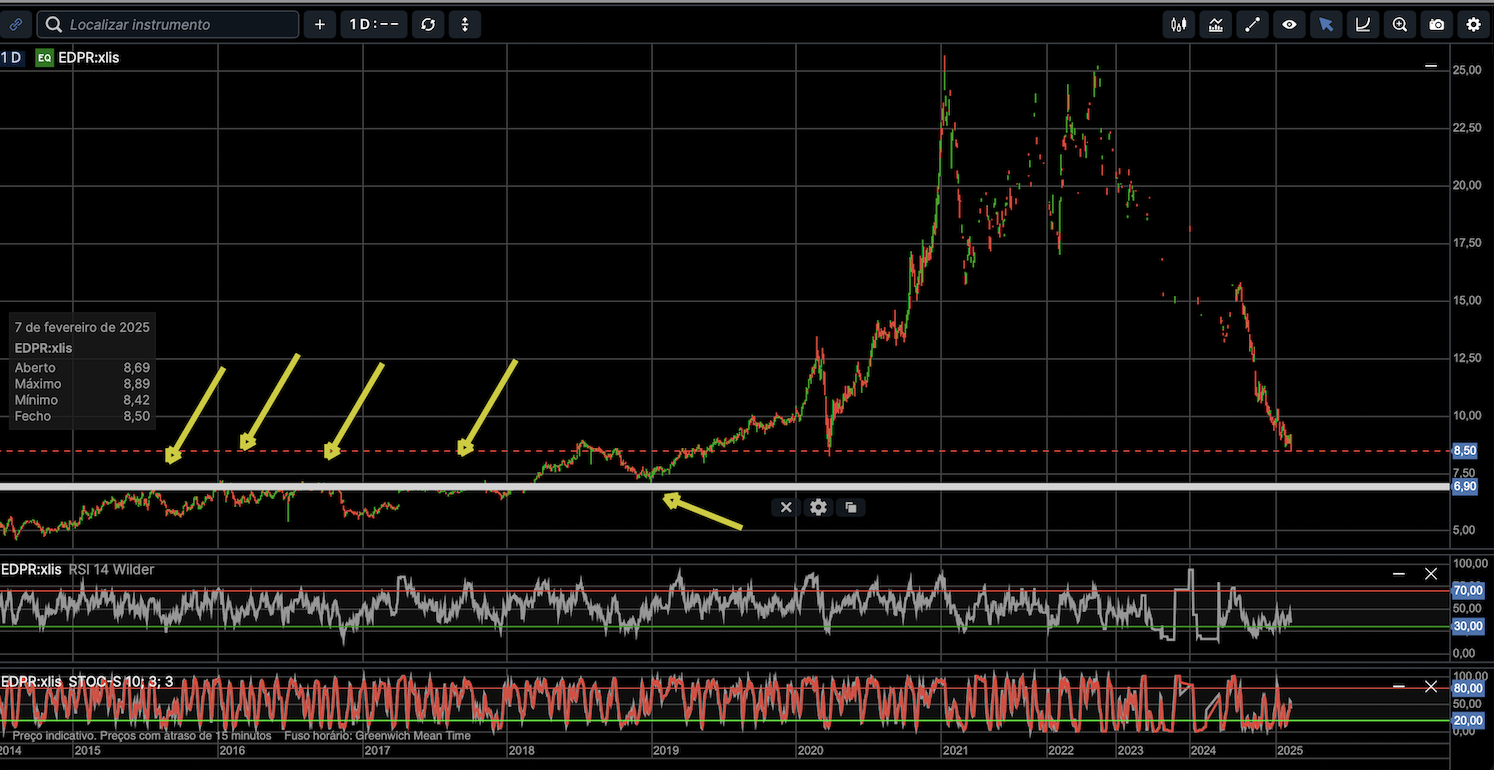 zona dos € 7,00 | € 6,80 suporte | resistência em 2015; 2016; 2017; 2018; 2019