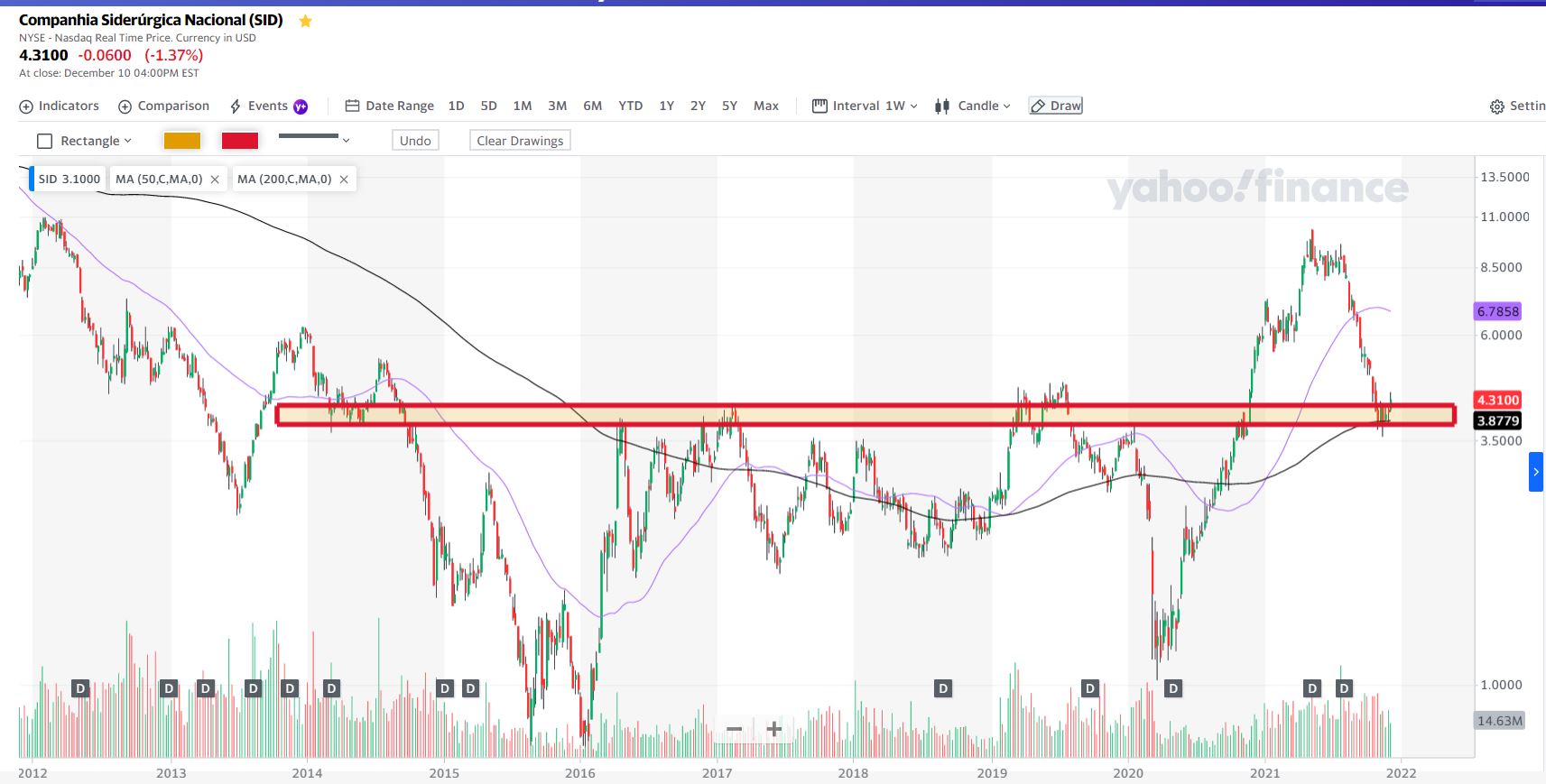 Para lá do gráfico semanal da SID junto também o gráfico semanal do minério de ferro, que após uma queda violenta aparenta, também estar a reagir à zona actual