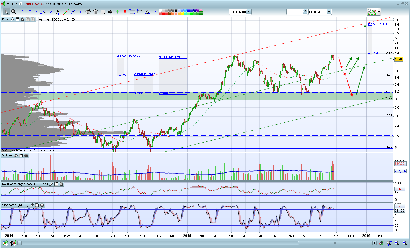 Resolvi entrar curto na altri no final da sessao,stop loss 3,45€,projecao do duplo tecto caso se confirme na casa dos 2 € com a perda da necline,medias moveis com cruzamentos descendentes em grafico 120 min e diario,trix em terreno negativo.Temos ainda um pequeno gap ate aos 3.24€.