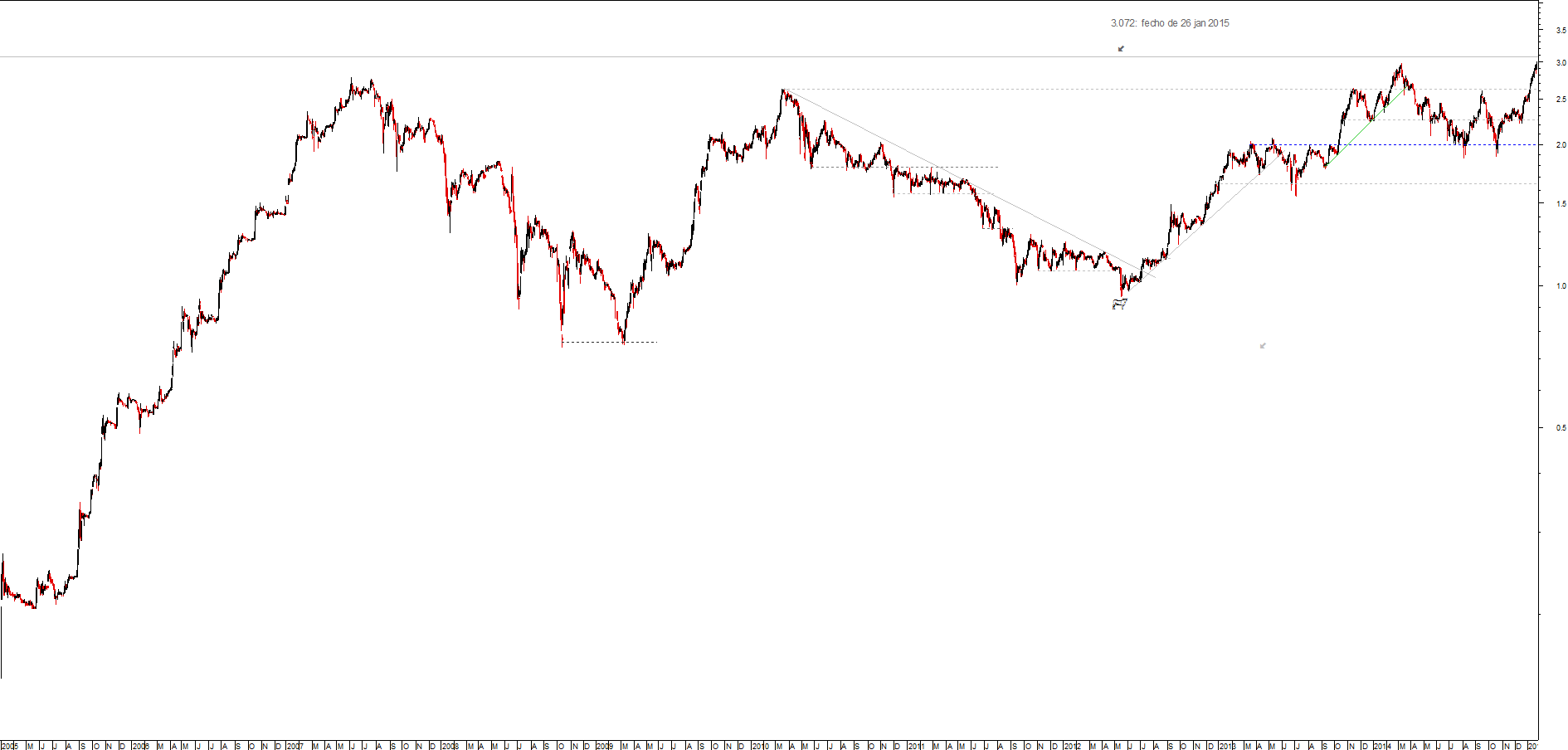 Se virar para baixo e quebrar os 2.95€, teremos a activação de um duplo topo, característico das inversões de tendência. (acho que este é um cenário menos provável)