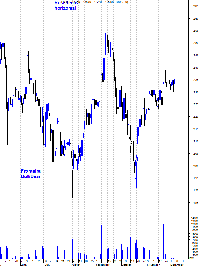 Aguentou estoicamente a fronteira entre o "Bear" e o "Bull Market" e agora o cenário perfeito seria uma consolidação em torno da resistência quebrada nos 2,6, de forma a proporcionar novas oportunidades de entrada a quem está de fora. Mas o mercado nem sempre nos dá essas oportunidades limpas.