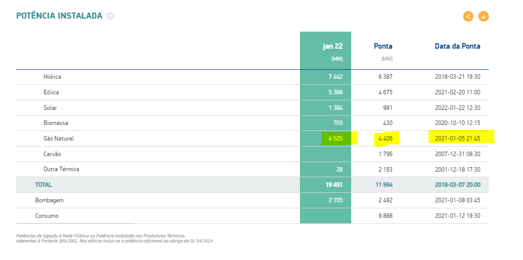 Produção eléctrica a partir do gás no mês de janeiro de 2022: