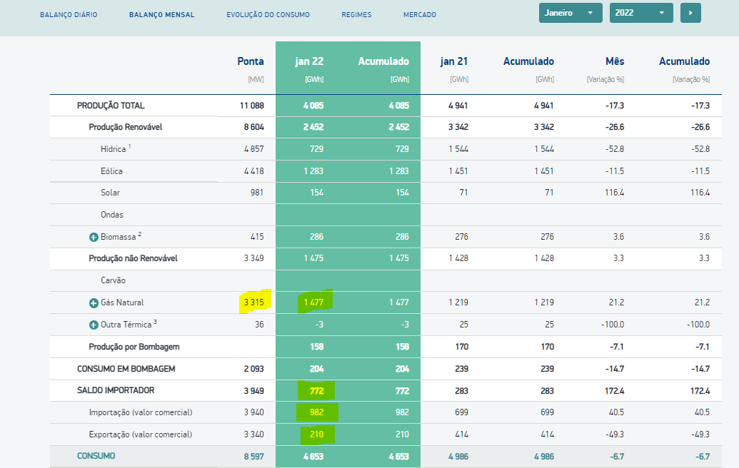 Contas feitas, Portugal produziu (eletricidade) menos de metade da sua capacidade instalada a partir do gás. Se Portugal optasse por produzir eletricidade a partir do gás, na sua capacidade total, a produção excedia em muito o consumo.