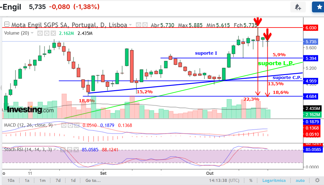 MACD e RSI semanal parecem apontar para subida sustentada, ao passo que no curto prazo parecem estar a perder força.
