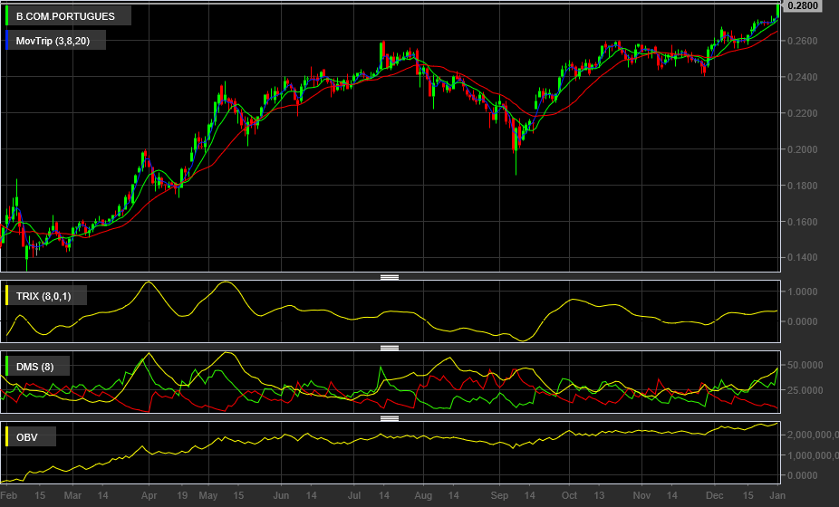 Como nos últimos dias de Dezembro consolidou nos 0,27€ agora atingiu os 0,28€ creio que uma correção ainda não será para já pois no inicio do ano a tendência do mercado por norma é de subida.