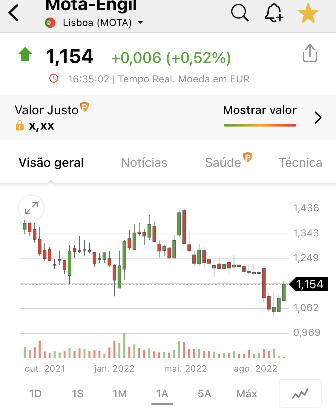 Esquecida por uns tempos, aguardo sinal de passagem dos 1.228. Se acontecer... aí a Mota vai avançar. Tem ali aquela diagnal bem dura de roer. Não será à 1.ª. Mas se fechar acima de 1,228, aí tem mesmo um espaço grande de subida.