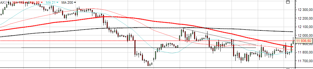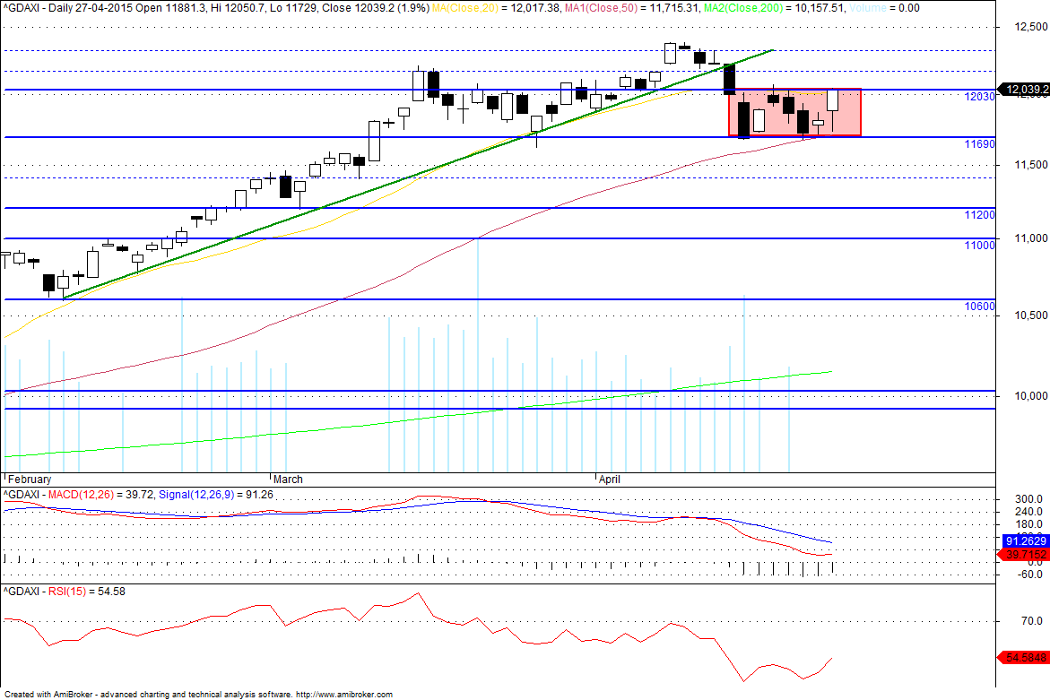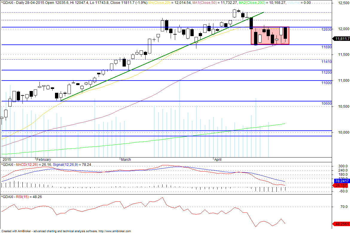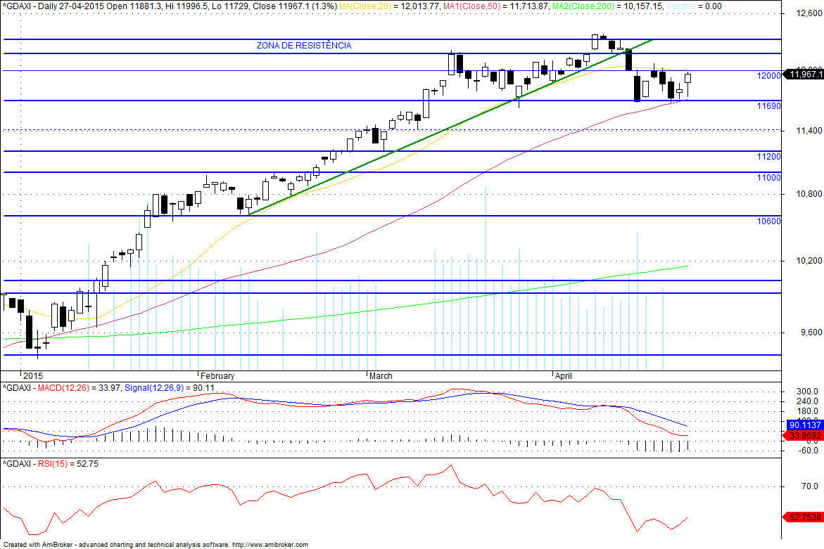 No DAX também penso que o rectângulo define curto prazo, com resistências nos 12040/75, 12150 e 12400, mas se voltar a quebrar os 11800 os 11700 não o deverão travar até aos 11600 e 11400.