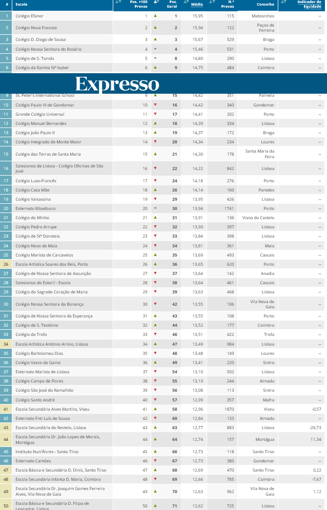 O Observador omite escolas publicas nos primeiros 50, por exemplo a Escola Artística Soares dos Reis, Porto que fez só 620 provas.
