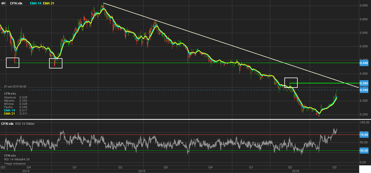 Isto promete, o rompimento dos 0.365 levará a acção até a zona dos 0.44 que é a próxima resistência visível, caso se confirme quebrará a linha de tendência bear e podemos sonhar com uma mudança de tendência bull, até lá aguardar com paciência.