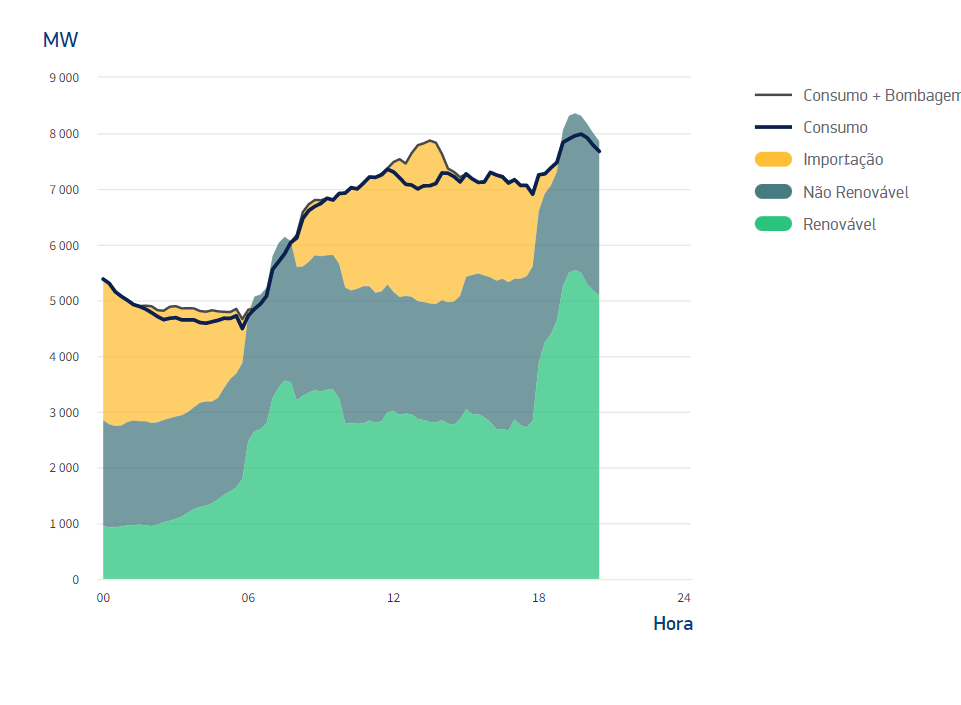 E no período de maior consumo entre as 19 e as 20:30 horas, Portugal não importou energia elétrica (muito provavelmente tendo em conta o seu preço). Todo o consumo foi satisfeito pela produção nacional.