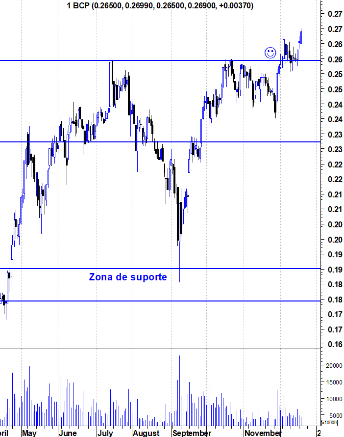 Se, e saliento o se, a Sonangol esteve a reforçar a sua posição, é natural que tenha querido comprar a um preço mais baixo possível e isso representa uma pressão sobre a acção. Talvez esse reforço possa explicar o facto de o BCP ter andado tanto tempo abaixo dos 0,26. Se, e volto a salientar o se, a Sonangol já terminou o seu reforço, é natural que deixe de haver uma pressão sobre a acção e esta se liberte das amarras que a mantiveram tanto tempo em valores abaixo dos 0,26.