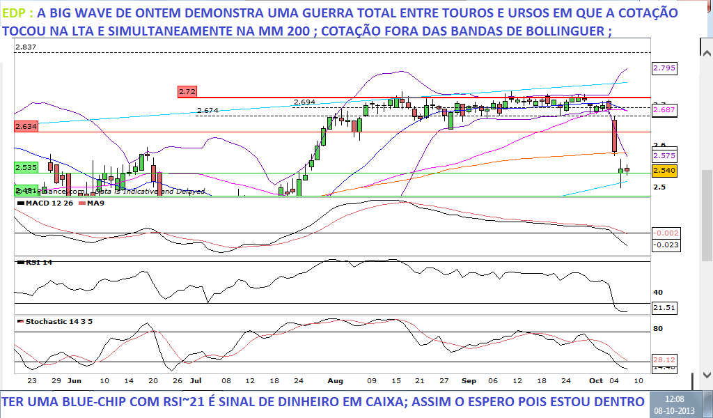 O meu comentário em relação à acção da EDP é que não se confirmou o Mornig Star, pelo que não vejo nenhum sinal de mudança de tendência no curto prazo. Após o dia de hoje, aponto para o suporte na casa dos 2,47€ (mais coisa menos coisa). Depois logo se vê.
