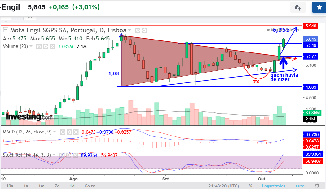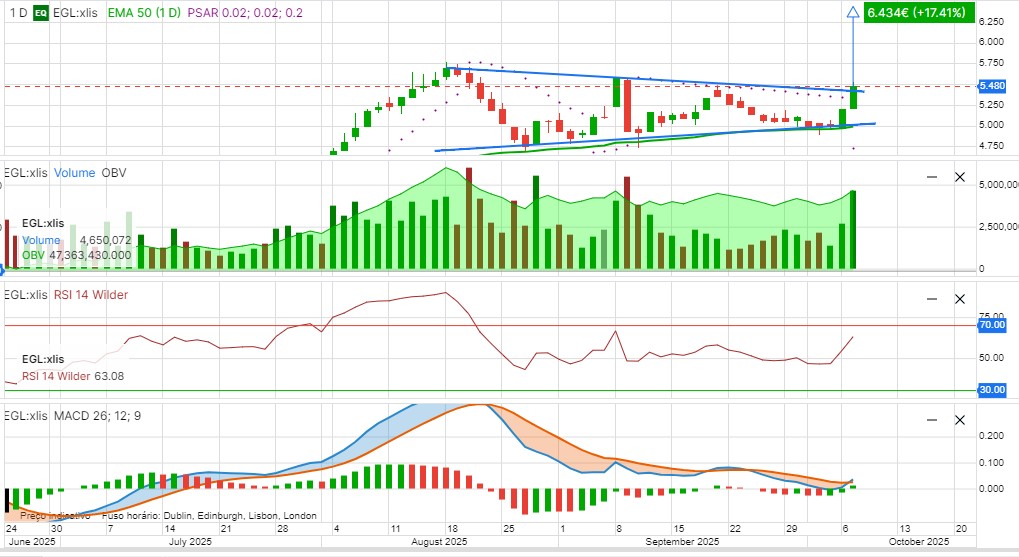 Notem que o breakout do triângulo simétrico permite traçar uma projeção de subida equivalente à base do triângulo, ou seja, até aos 6.43€, um ganho de 17.41%.