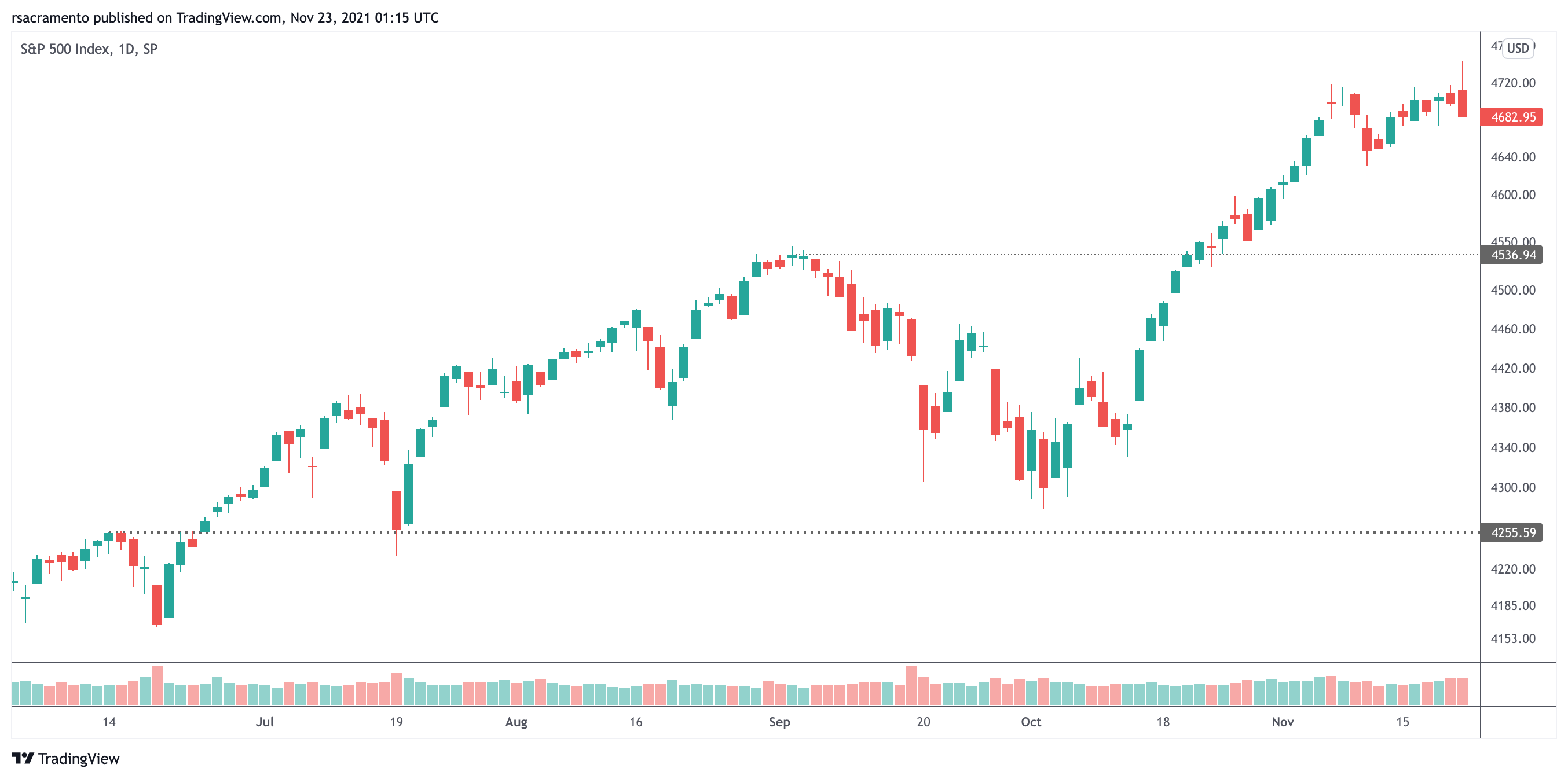 Apenas estava a referir que o fecho não foi o melhor e que um recuo no curto prazo podia acontecer. Para desenvolver um pouco mais, acrescento que na minha opinião essa pequena correção poderia ser até à zona de 4530~ para testar o suporte horizontal, apenas isso! Os principais índices continuam "bullish" em todos os horizontes temporais e tens toda a razão, um recuo de 0.32% depois de máximos históricos não é nada no enquadramento geral. Enquanto não quebrar um suporte (pelo menos) é business as usual.