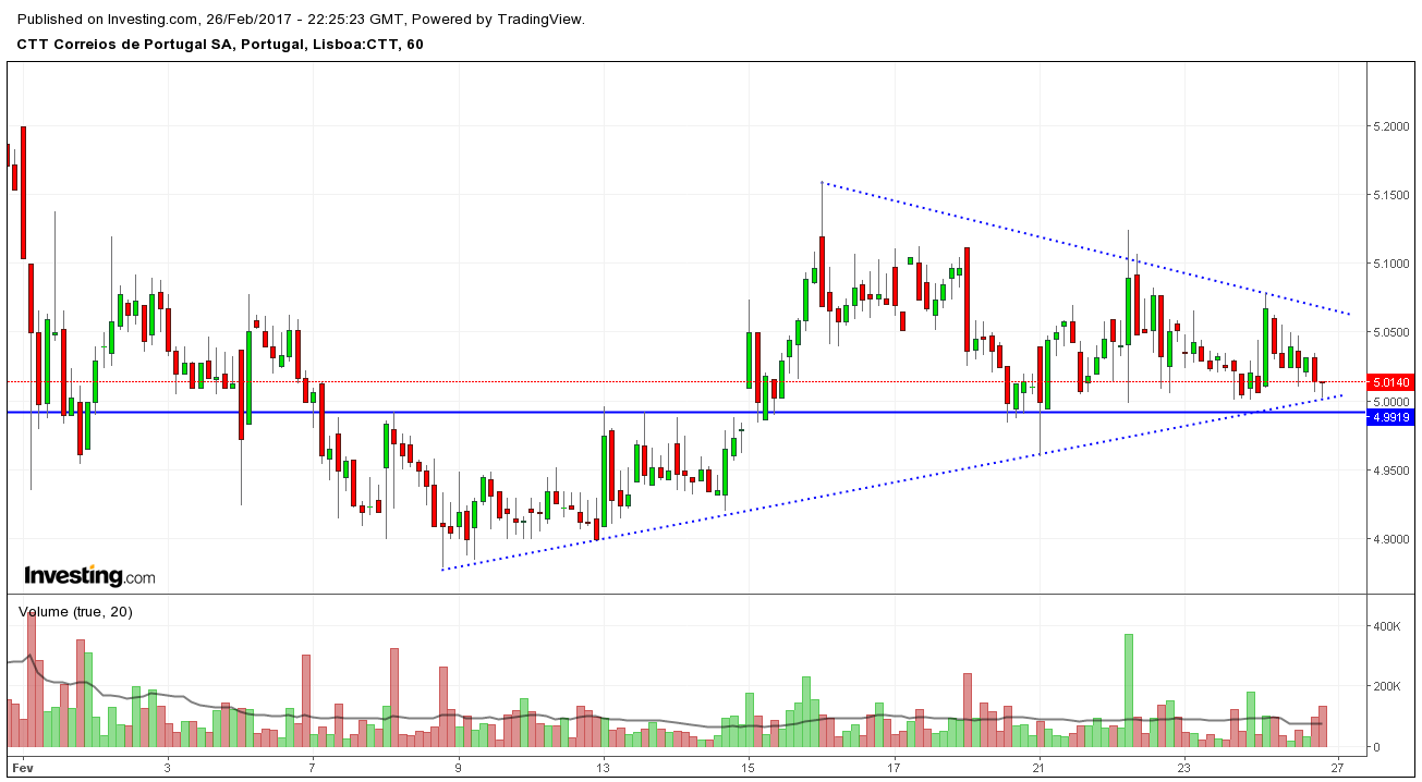 Comentário diário sem alterações nos CTT que continuam a sua demorada consolidação no canal (4.9 mega suporte/5.66 topo/5€ não têm relevo como suporte).