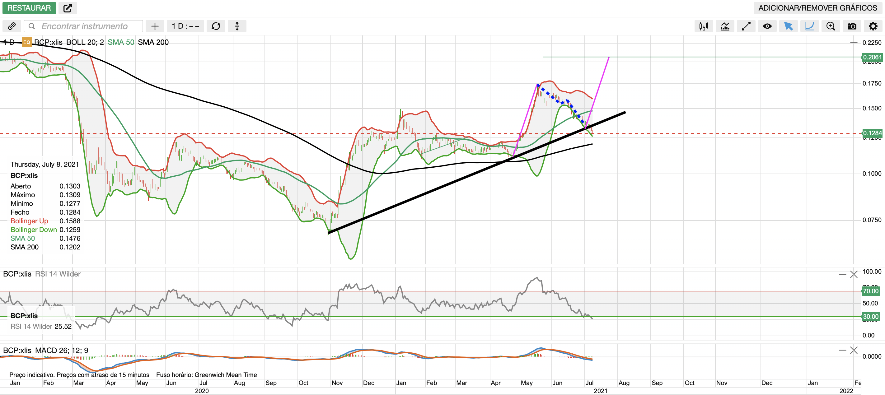 Terceiro toque atingido. Chegámos ao ponto decisivo, vamos ver se reage e confirma a LTA, ou continua em queda e fica com mau aspeto...