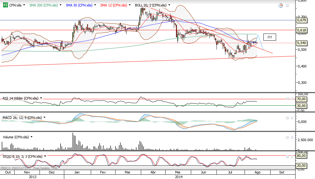 Parece estar em excelente momento para uma entrada com eventual stop abaixo dos 0,54. Target 0,8 a 1,2.
