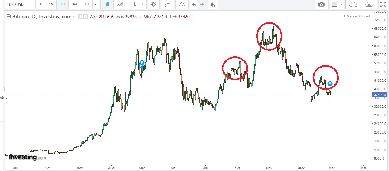 Estão a dar uma oportunidade de venda, ou é mesmo verdade que as cripto sobem por razões com fundamento. Até o líder ucraniano recebe apoios de 17 milhões em cripto's! (cheira a propaganda de guerra, mas... quem sabe?). Não sabemos, mas dá que pensar... Uma coisa é certa, não cairam dos suportes principais e o sonho dos touros continua válido.
