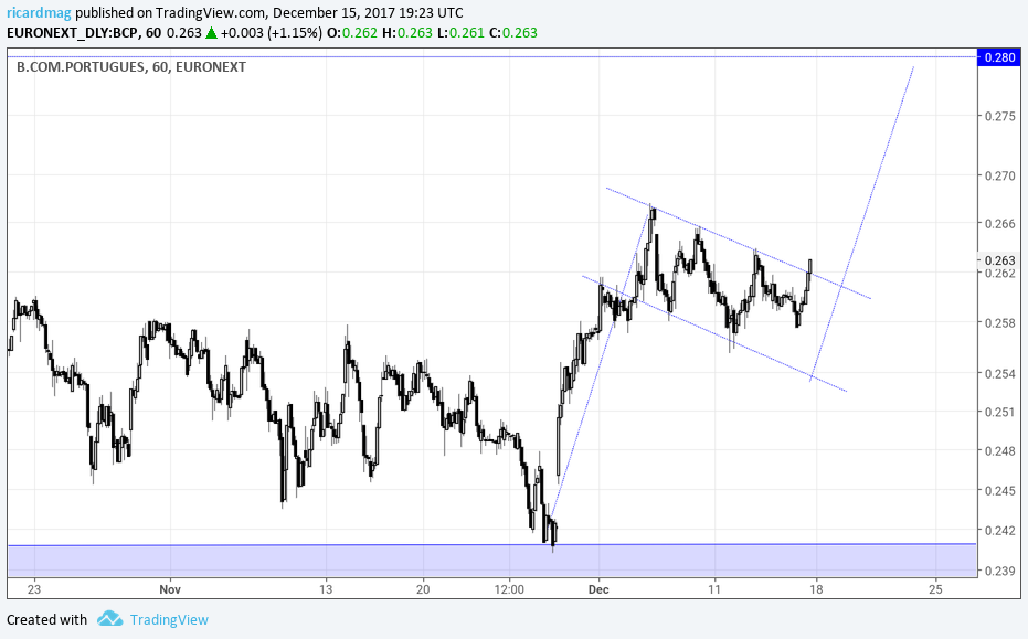Subindo na segunda-feira e se se aguentar perto ou até depois dos 0,27 fica claro para todos que a resistência foi pulverizada. Fica claro que os 0,26 são um suporte e muito forte. Já era claro que a próxima resistência relevante está na zona dos 0,40. Irá chegar a essa resistência já nos próximos dias? não, nem pensar. Mas que tem condições para chegar lá no primeiro trimestre de 2018, lá isso tem.