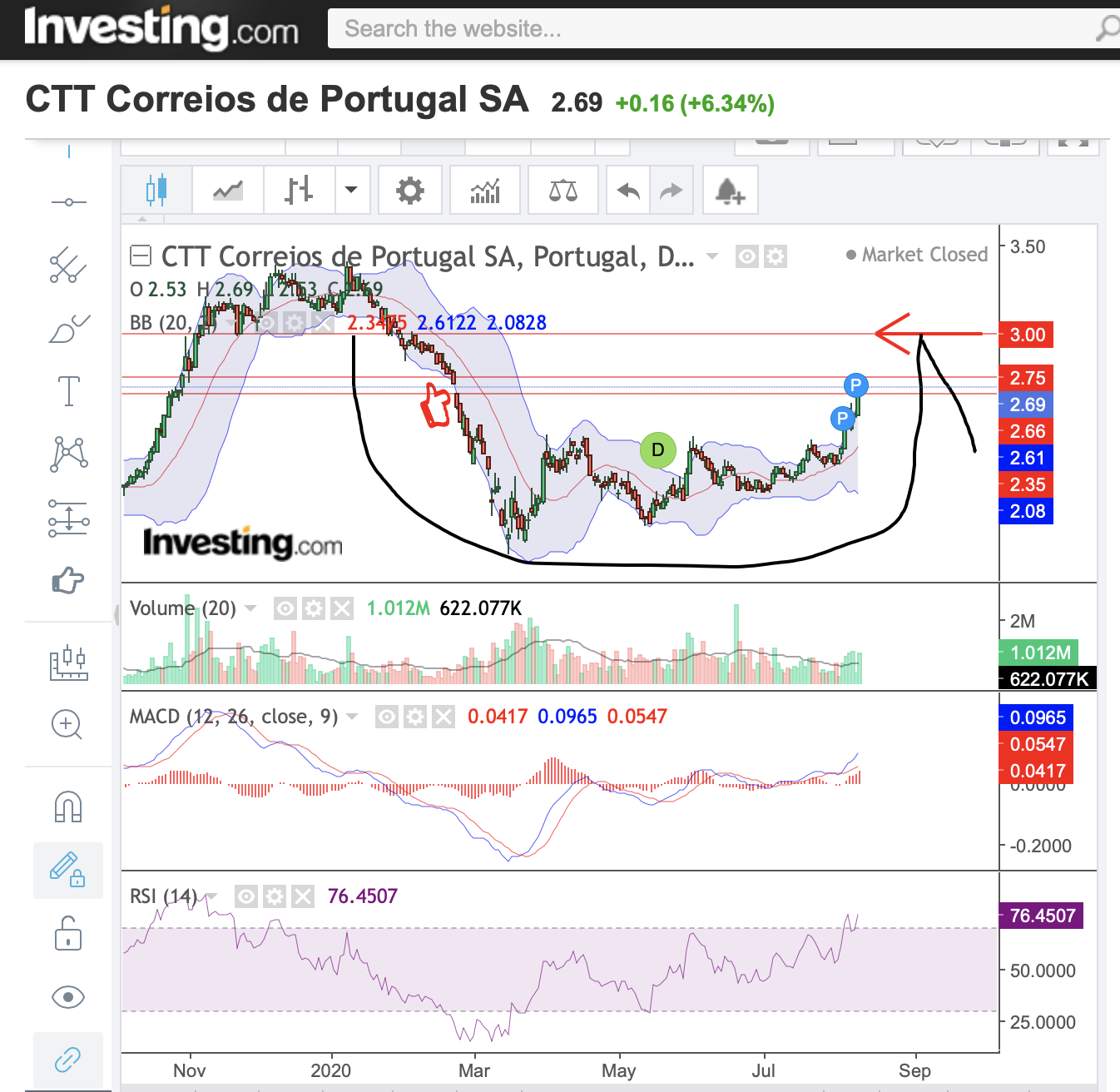 continuando nos ctt, uma ida aos € 3,00, para novamente corrigir, pois é uma zona de resistência, também é possível....