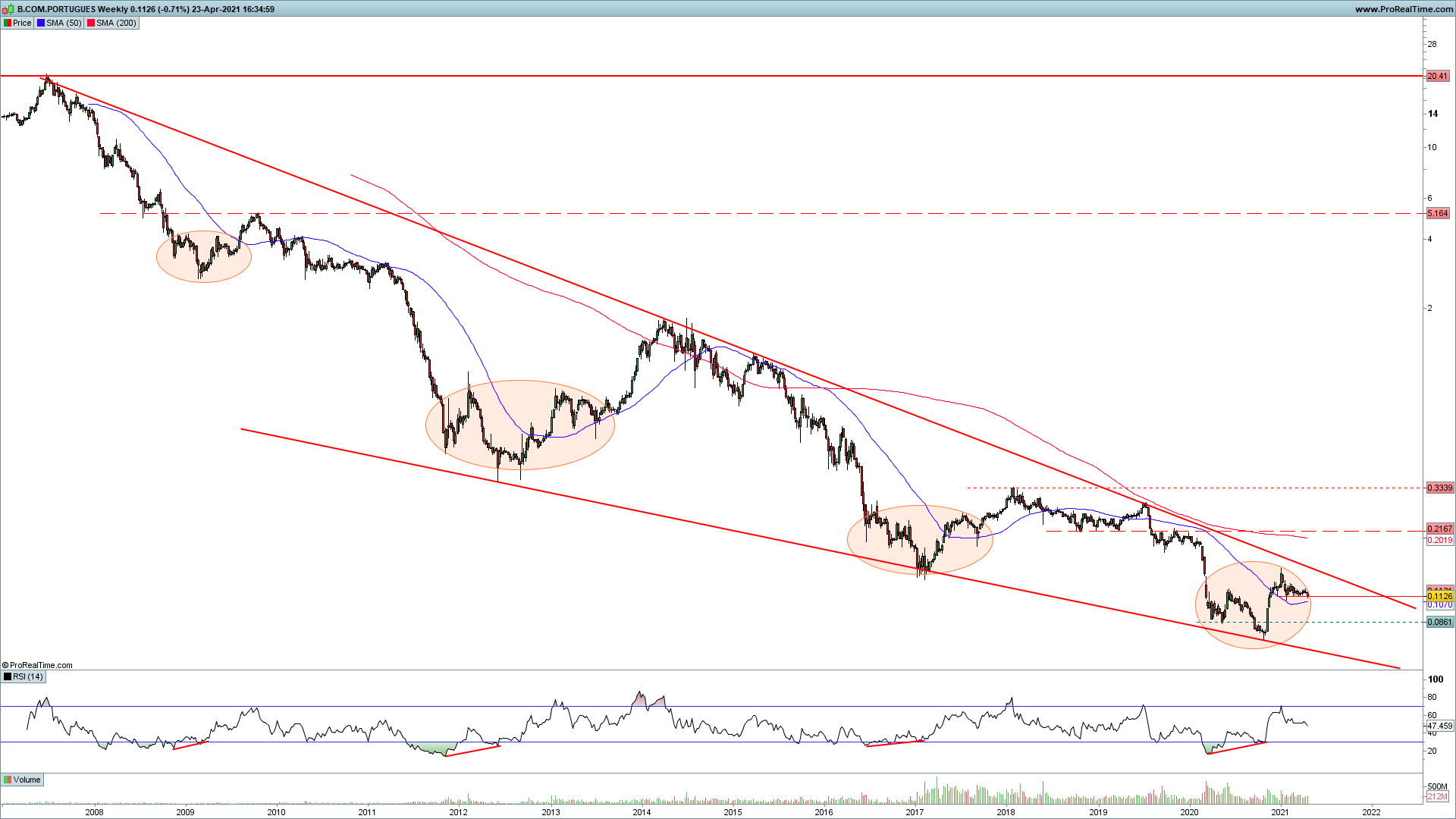 No semanal vejo isto. O BCP dá uns ressaltos engraçados e com uma similaridade entre eles interessante. Parece estar a desenhar uma enorme wedge e está neste momento na chamada 'zona de ninguém'. A tendência de médio-longo prazo é claramente descendente.