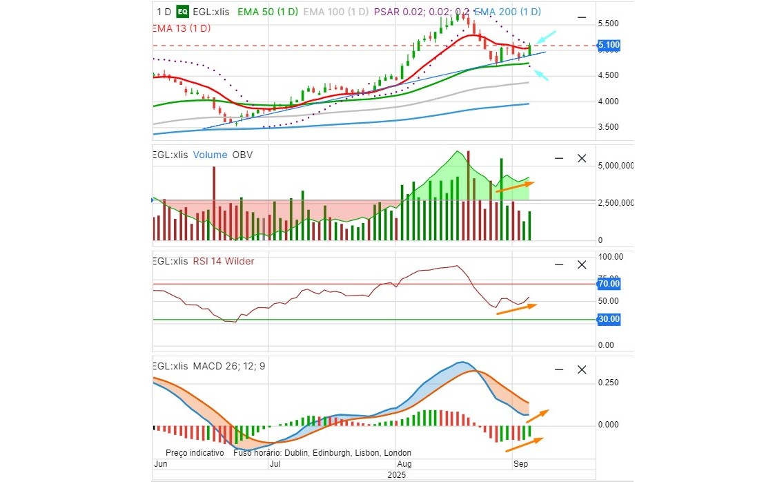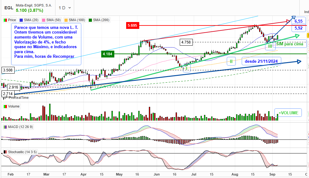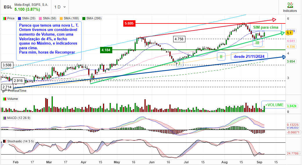A conjuntura atual apresenta alguns riscos, nomeadamente no que diz respeito à situação Francesa e Inglesa, mas aparentemente os mercados, para já, estão a ignorar "o fumo". Se não se confirmar o "fogo" (eventual resgate do FMI à França), parece-me que a Mota está bem encaminhada para testar novamente o intervalo de 5.70€ a 5.90€.