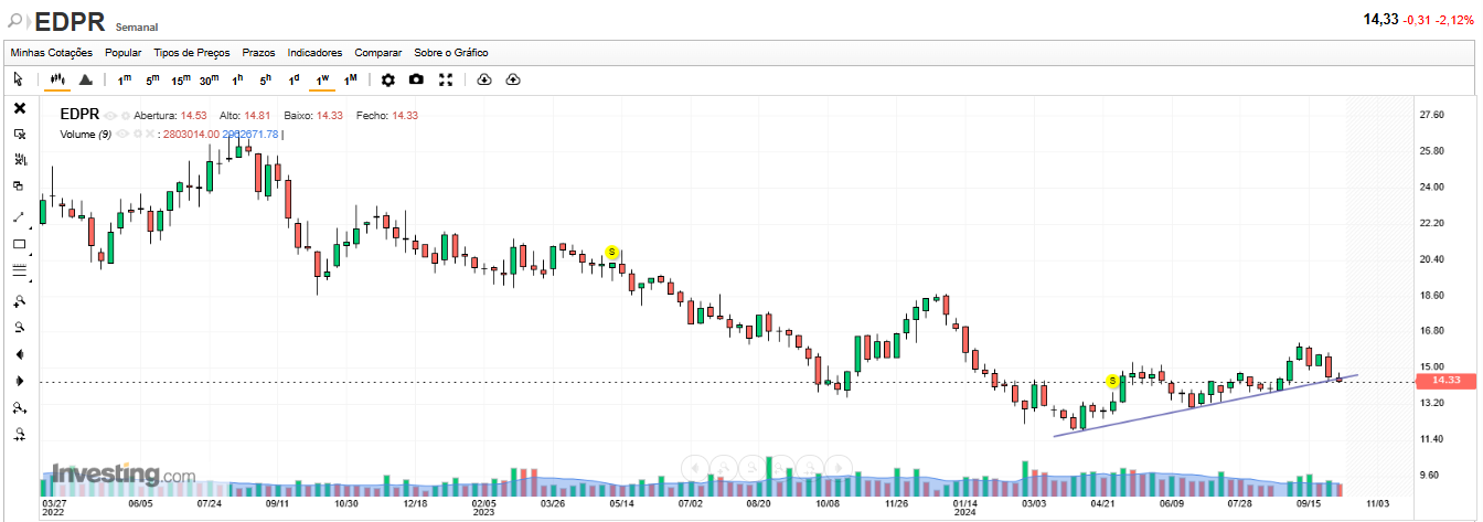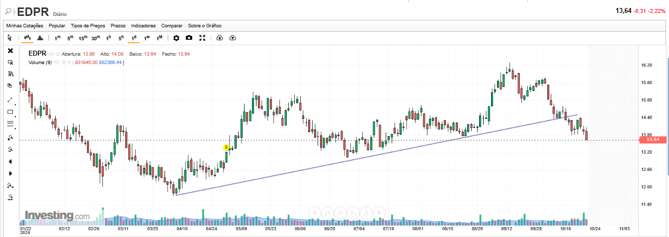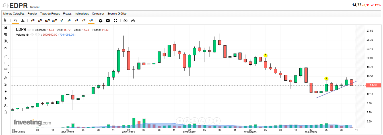 Em 10/10/2024, alertei para a queda futura da cotação da EDPR, indicando que quer o gráfico diário, quer o gráfico semanal, quer o gráfico mensal da EDPR, apontavam para a queda futura da cotação da EDPR.