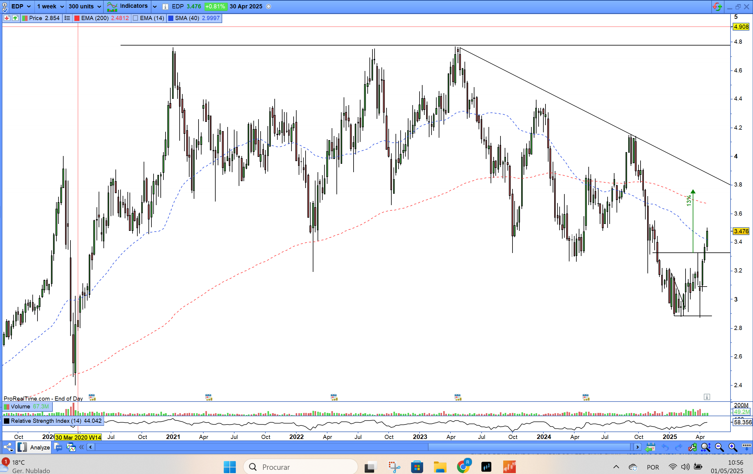 A cotação da Edp está imparável. Acima da média móvel 200 dias com cruzamento de médias móveis. Tudo a favor para que este movimento continue até aos 3,60€ antes do pagamento do dividendo.