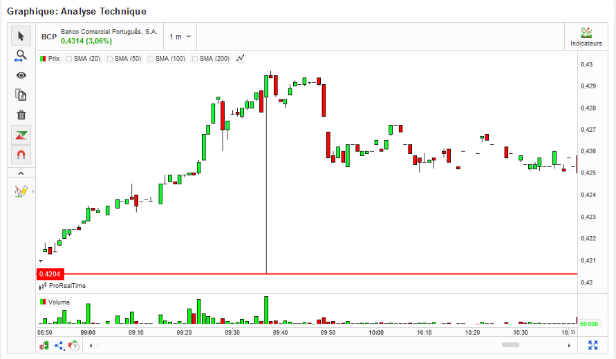Ás 9h37 o gráfico tem um movimento estranho de descida e são transacionadas quase 5 milhões de ações nesse minuto.