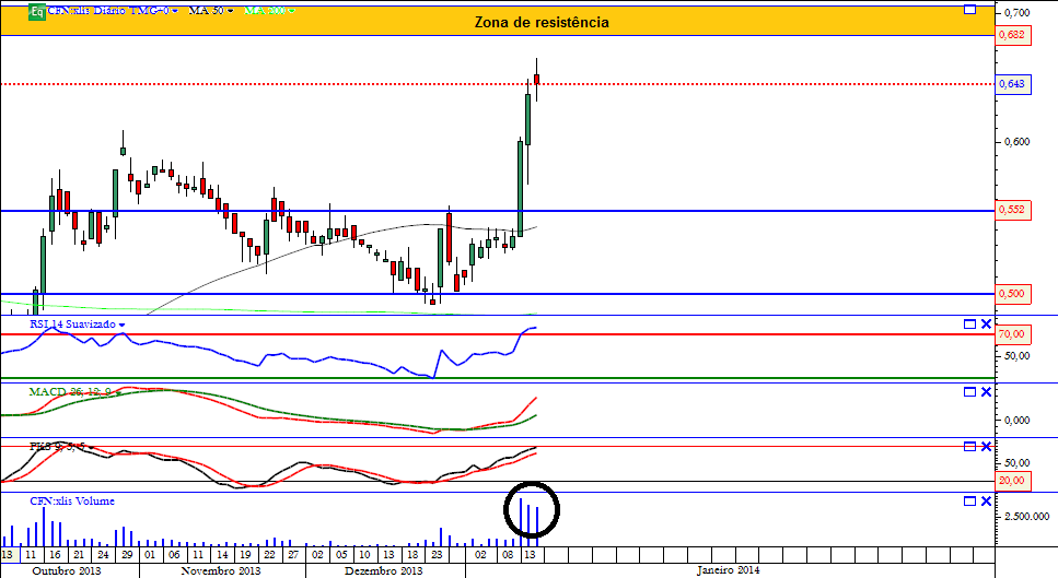 Se vai assentar uns dias, não sei, mas enquanto continuar este volume com velas diárias "catitas" tem condições para subir ainda mais. Se a LTd for realmente quebrada e posteriormente a resistência nos 0,70€ considero que a Cofina entrou em Bull Market, e se assim for o ano de 2014 seria potencialmente bastante positivo.