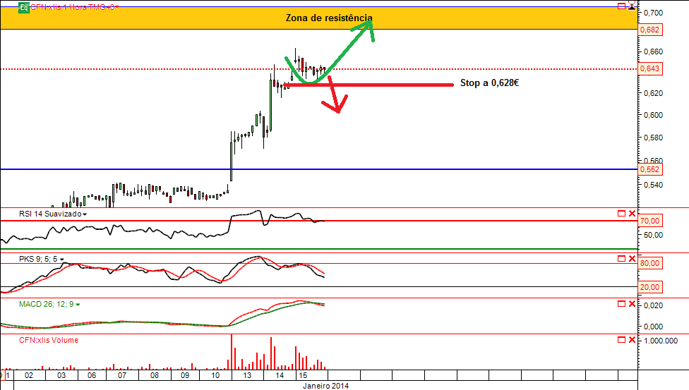 Neste momento para quem está fora como nós... Sabemos que houve um fortissimo sinal de inversão de tendência de médio/longo prazo com o breakout da LTd com enorme volume, logo sabemos também que investir dos lado touros será a melhor opção, sabemos que a cofina se tornou num possivel cavalo de corrida para o ano corrente, mas também sabemos que isto não vai ser sempre a subir e vamos ter correcções pelo meio. Por isso saltámos fora ao menor sinal de perigo (se calhar mal, dirão os investidores com um perfil mais passivo). E agora quando voltar a entrar? Na minha opinião das duas uma, ou no reteste à LTd, que anda neste momento ali pelos 0,5xx, ou então no breakout da zona de resistência por volta dos 0,70€. Sem ser numa destas opções parace-me que é entrar no vazio, e com uma colocação de stop que não trás um bom compromisso entre rentabilidade/risco.