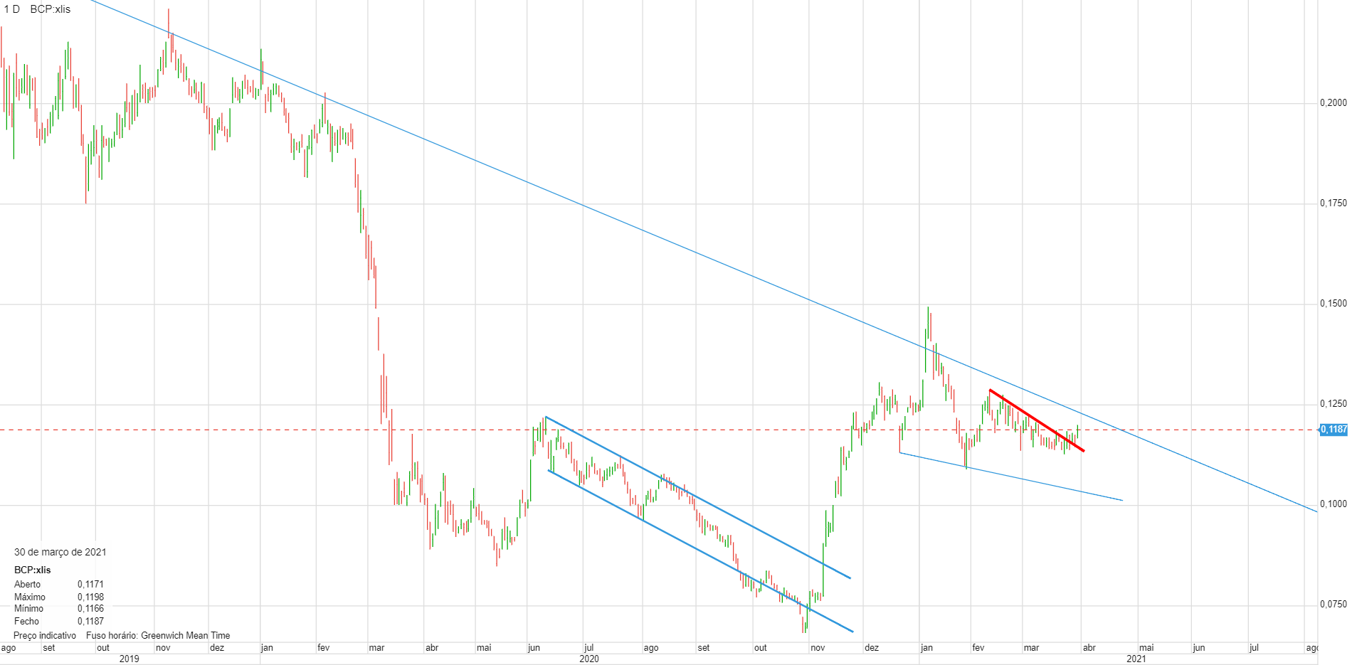 A LT de curto prazo (a vermelho), que vinha limitando o preço do BCP, foi quebrada - ou melhor, foi furada - já que a quebra, não se deu com uma subida que se veja