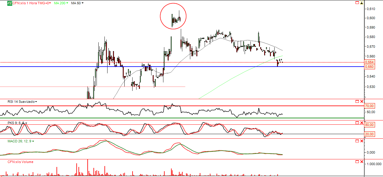 Embora a vela de hoje revele muito pouca força compradora, o suporte que tinha estabelecido fica nos 0,55€. Vamos ver para onde caminha na próxima semana, se bem que o cenário se esteja a tornar pouco interessante para quem está dentro e longo.
