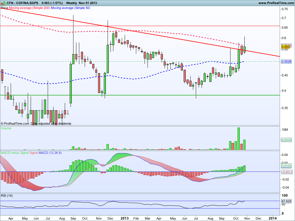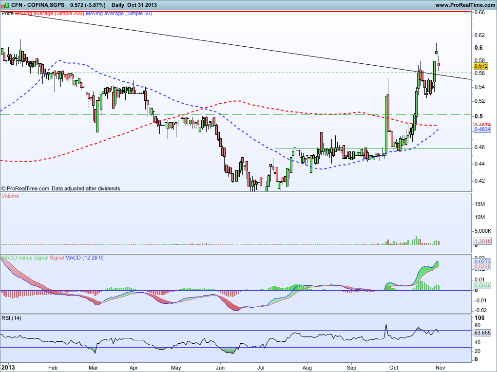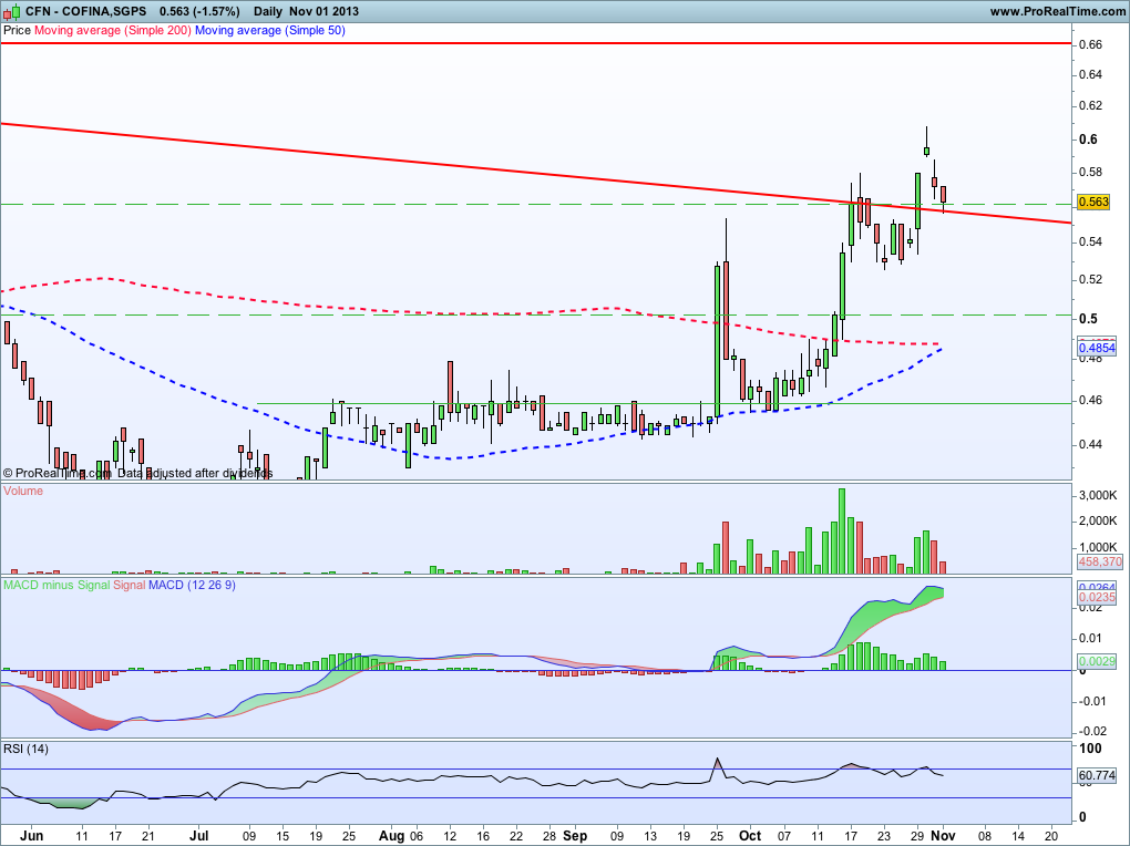 O Macd na Cofina não tem sido dos mais fiáveis, veja-se o início do mês passado. Os ,56 parecem-me ser a referência mais importante para controlar, e a visita a estes níveis é simplesmente saudável. Convém não esquecer o tempo que levou a marinar nos ,45-,46, num passado que parece distante, mas é bem recente. Pode ser que a Cofina conheça finalmente o que significa subida sustentada, com pausas para respirar e ganhar fôlego para novos degraus...