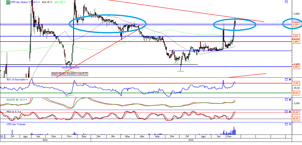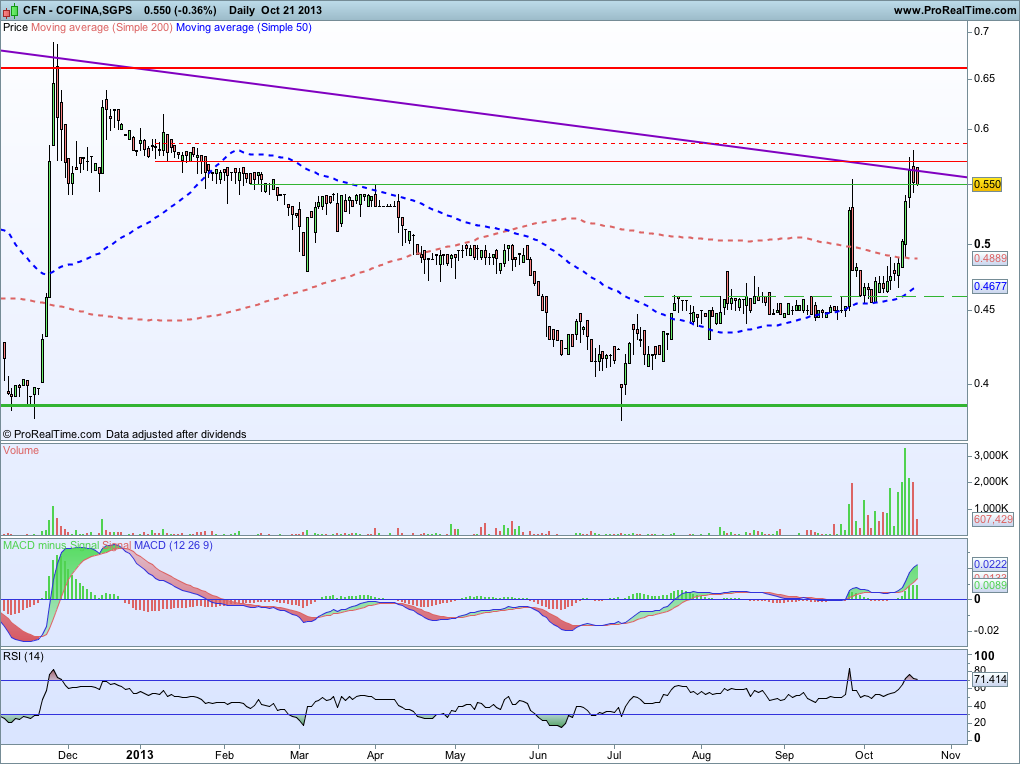 Relativamete à Cofina, compreendo bem esse teu "pé atrás". É uma acção que nos tem mostrado nos ultimos tempos que pode ter movimentos muito repentinos em ambos os sentidos. Se esta última subida se tem mostrado sustentada qb, o final da última sexta-feira não foi muito encorajador. De qualquer forma, o suporte dos 0,55€ aguentou. Eu não consigo é perceber qual a força desse suporte. Parece-me que terei mesmo de esperar para ver