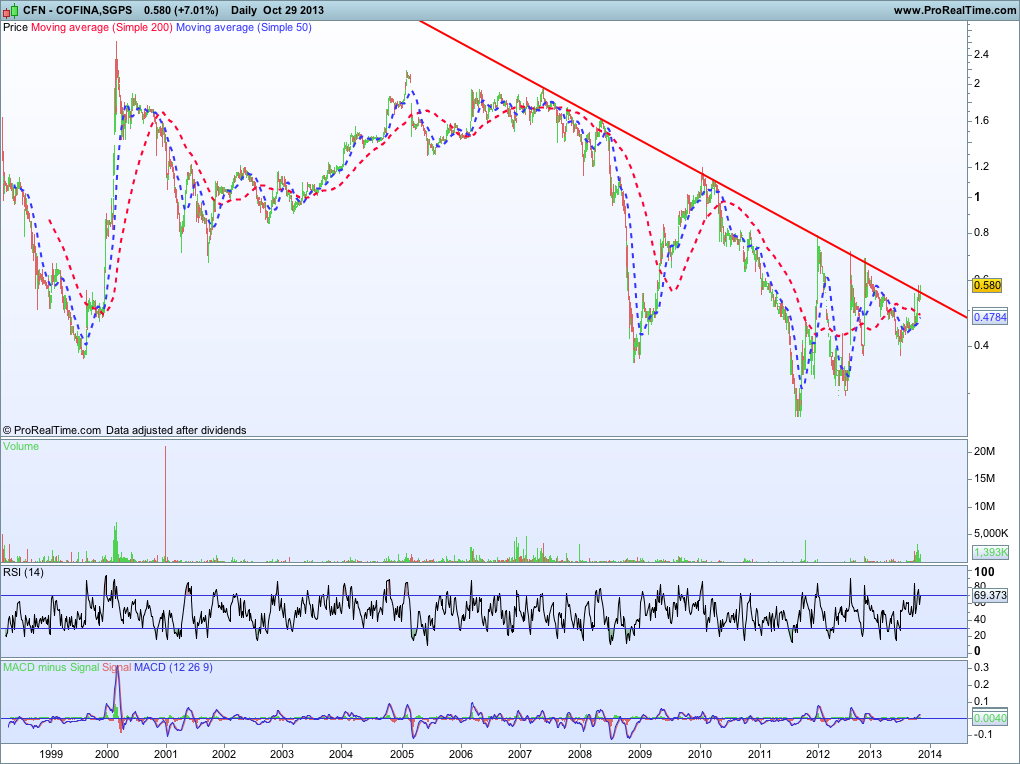 ) e parece-me que se o PSI conseguir quebrar em alta a resistência onde esta encostado, poderá influenciar positivamente a Cofina. Já para quem gosta de fundamentais e de noticias, acham que a acção vai esperar pela apresentação de resultados?