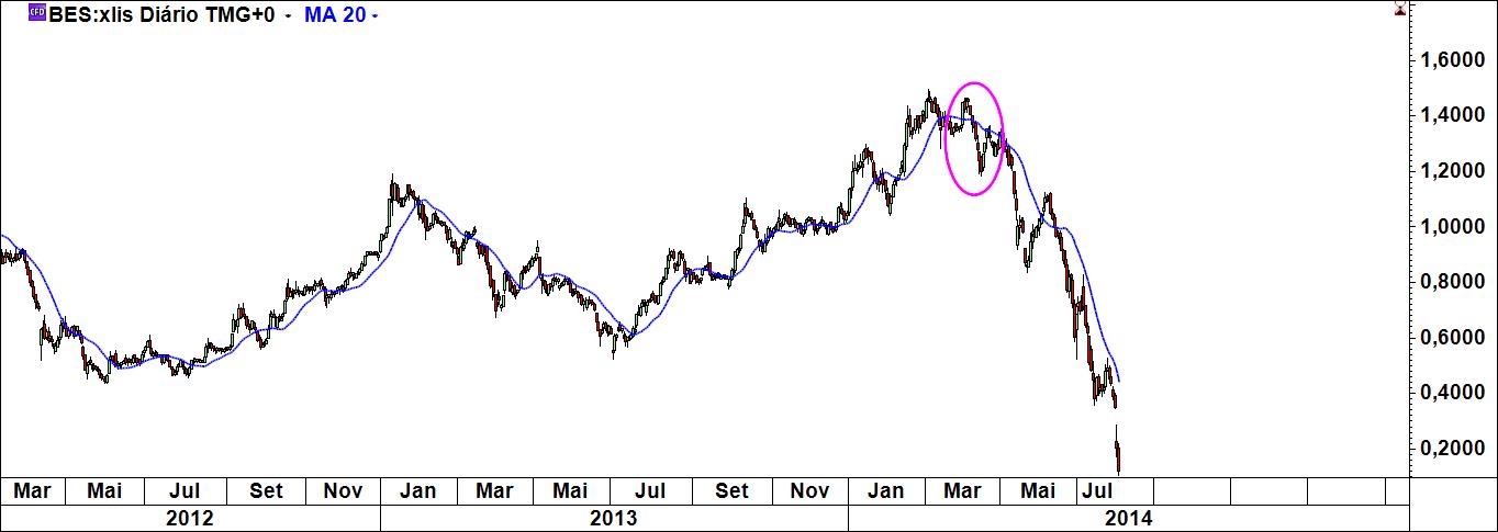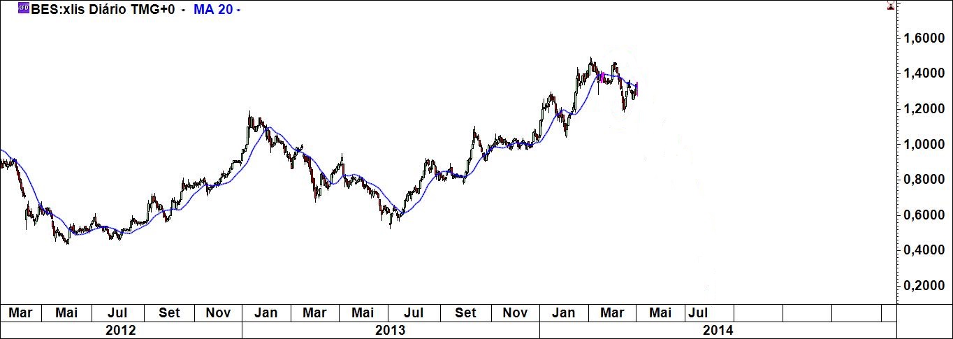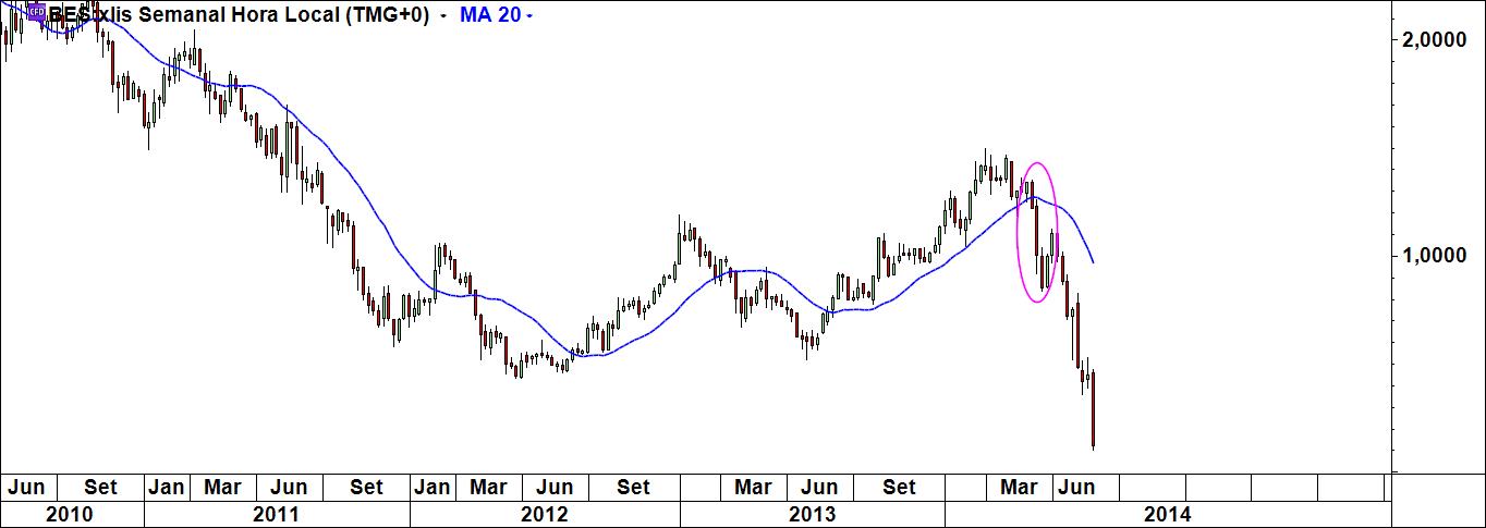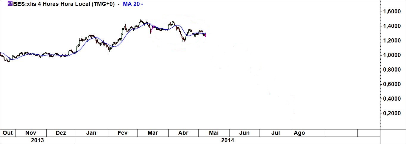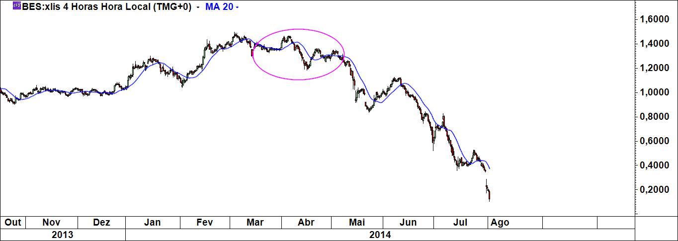 O facto de ter o meu sistema e dele não abdicar não significa que não olhe para outras coisas. Uma dessas coisas são as médias móveis. Abri três gráficos do bes (diário, semanal e de 4 h) e coloquei em todos eles a média móvel simples de 20 periodos (quem quiser faça a experiência com as mm 50 e 200). Só isso, uma coisa muito simples. O que é que se pode constatar? Em todos eles a mensagem era claríssima: fiquem de fora! Em todos eles, Virgem Santíssima!
