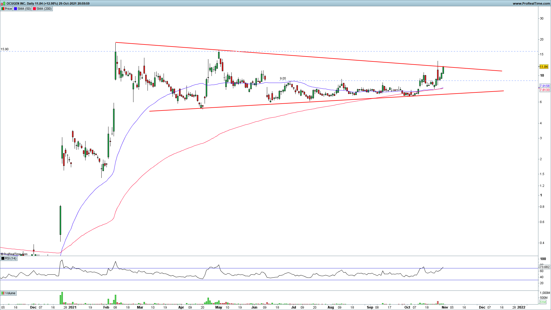 Despachei 25% da posição OCGN nos 16$ - overbought no diário (neste tipo de movimentos não é fulcral mas há que seguir as regras) e com o aproximar da decisão da WHO, não quero arriscar demasiado. Nesta fase precisa de se converter num movimento "parabólico" com short squeeze para sustentar a continuação de forte subida, na minha opinião.
