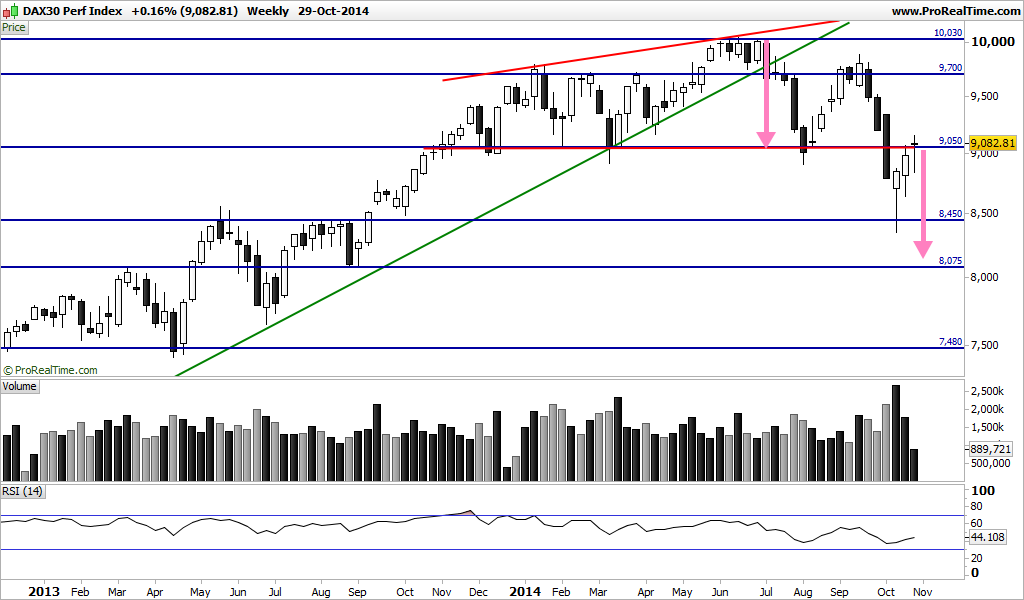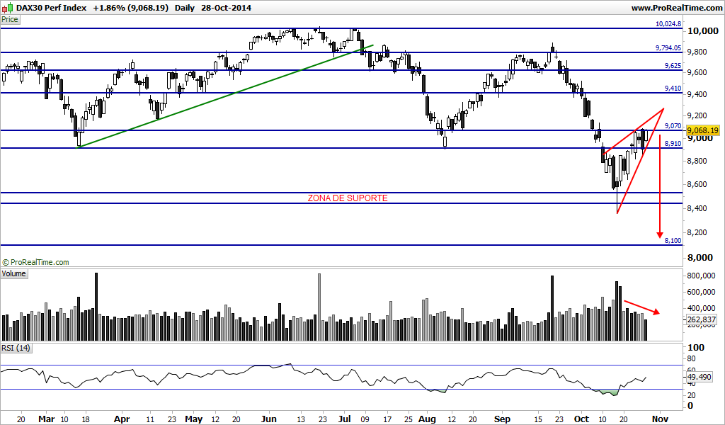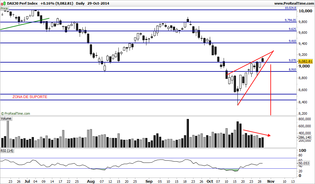Podemos estar perante a formação de uma bandeira de baixa. Na minha opinião podemos. O target é assustador? É, mas não quer dizer que ele se venha a concretizar na totalidade. Se o dax não quebrar em alta a zona dos 9070 pontos e se fizer uma quebra em baixa da zona dos 8850 com um aumento de volume ela pode acontecer. É preciso ainda olhar para a questão temporal que já começa a ficar apertada