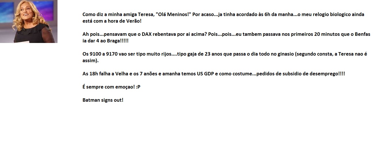 Entretanto...o DAX foi bater com os costados nos 9070-9080...tá ali mesmo...e parou! Tá em modo tantrico...fez-me lembrar varias vezes a minha pessoa, na nobre arte da pratica do "karate alentejano"...onde um tipo tenta aguentar...e as vezes consegue e tem mais 15 minutos à Benfica...ou puff...goes the weasel!