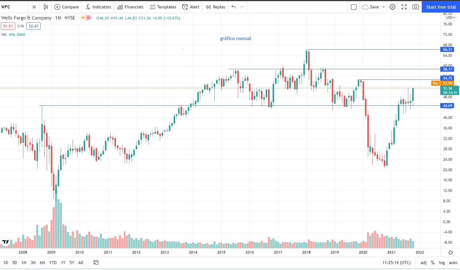 No gráfico mensal verificas o que existe pela frente na Wells Fargo & Company.