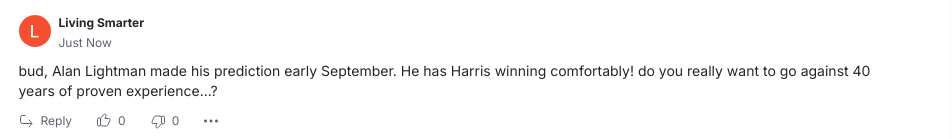 Depois de ver o comentário pesquisei por curiosidade quem ele achava que ia ganhar, e ele diz a harris.