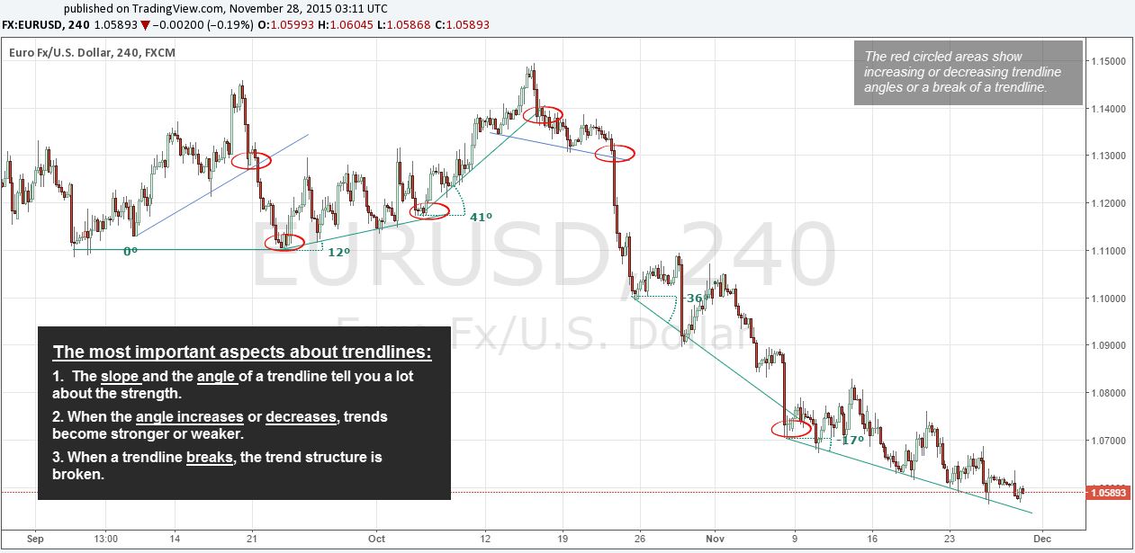 An increase in the angle of trendlines means that price is gaining momentum and price is making higher highs faster. Finally, a break of a trendline signals a broken market structure. A break can either mean a decrease in the momentum of a trend or a complete trend reversal.