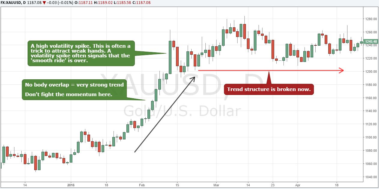 We already touched on this topic when we talked about pullbacks earlier but there are a few more things that we can use to our advantage when it comes to analyzing the dynamics between bulls and bears during trending phases. There are a few things a trader needs to be aware of when analyzing a trend and tries to estimate the strength: